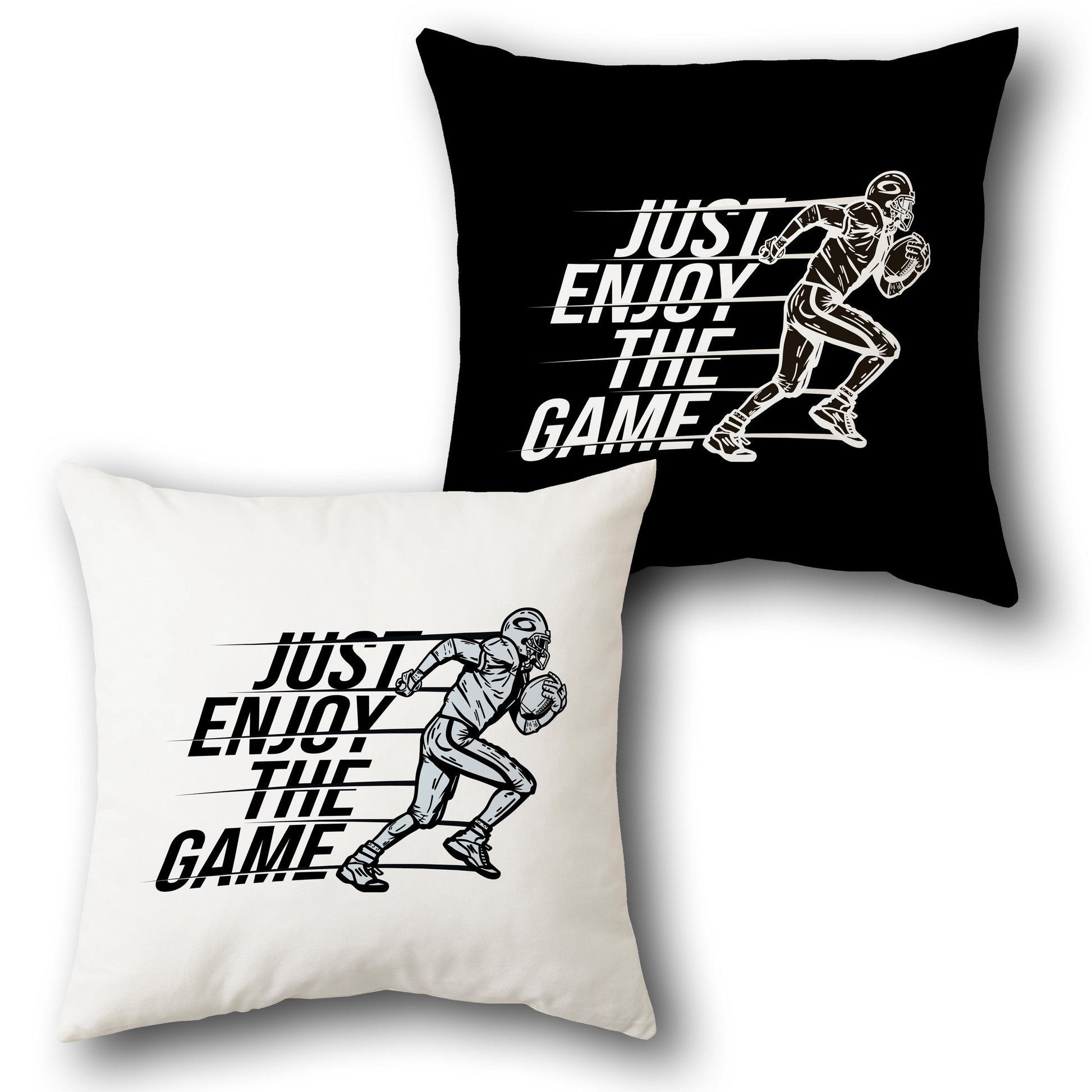 This sporty cushion features a football-themed design with the text "JUST ENJOY THE GAME" in bold, dynamic white lettering. The design includes an illustration of a football player in action, holding a ball, with motion lines for a sense of movement. It is available in two variants: one with a white base and black accents, and the other with a black base and white accents. Ideal for football fans to enhance their living space with a game-day vibe.