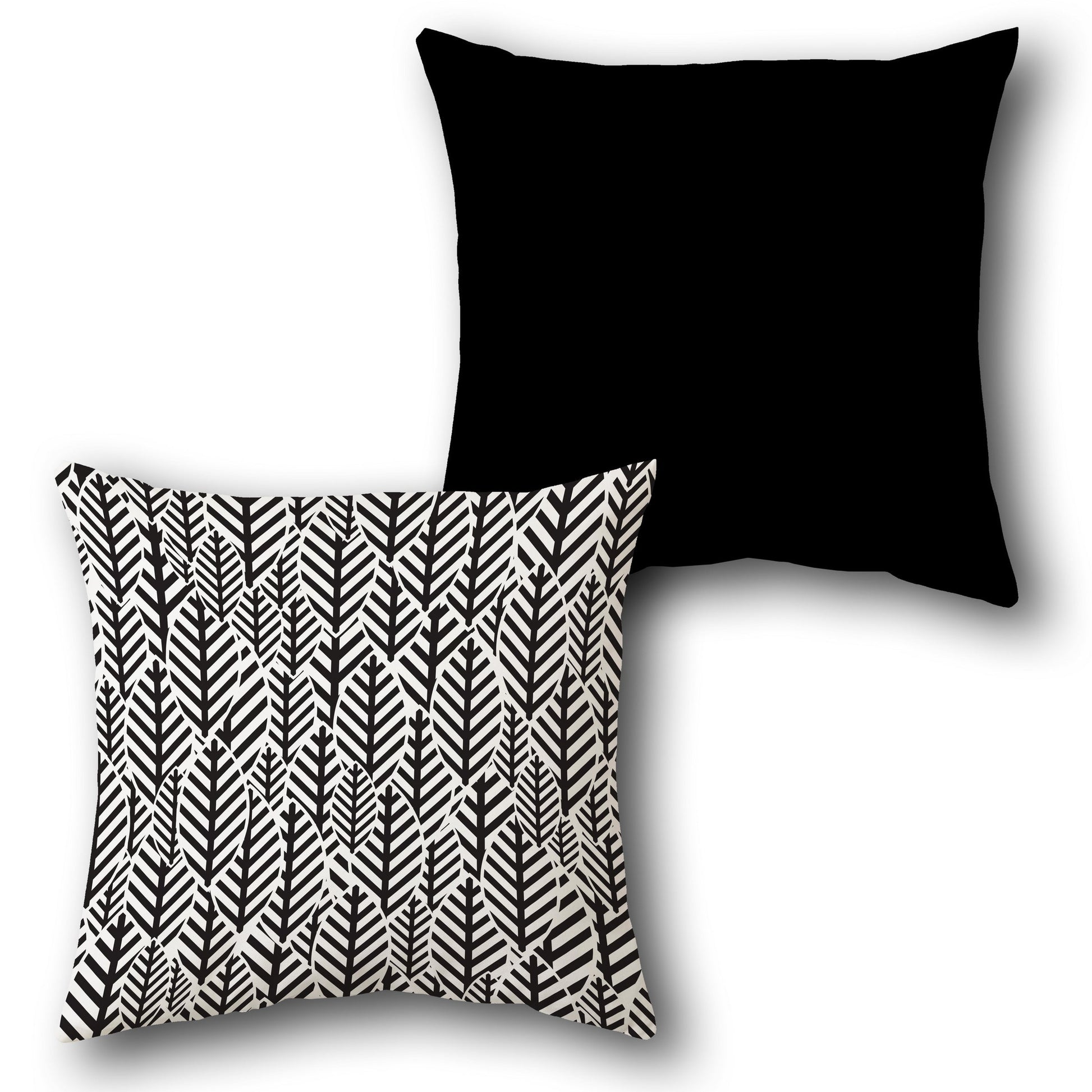 This cushion features a dual-sided design. The front has a white base color with a leafy chevron pattern in black, creating a striking contrast with repeating leaf shapes arranged in a geometric zigzag design for a modern, nature-inspired look. The back is a solid black, offering a sleek and bold contrast. Perfect for adding a contemporary, organic touch to any decor.