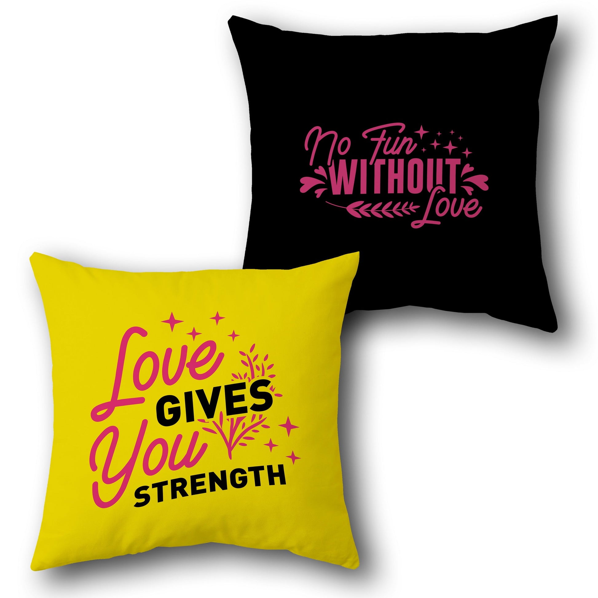 This single cushion features an uplifting design with a yellow base on the front, showcasing the text "LOVE GIVES YOU STRENGTH" in pink and black, with "LOVE" and "YOU" in a cursive pink font, accented by small star and floral elements. The back side has a black base with the phrase "NO FUN WITHOUT LOVE" in pink, complemented by tiny heart and leaf details.