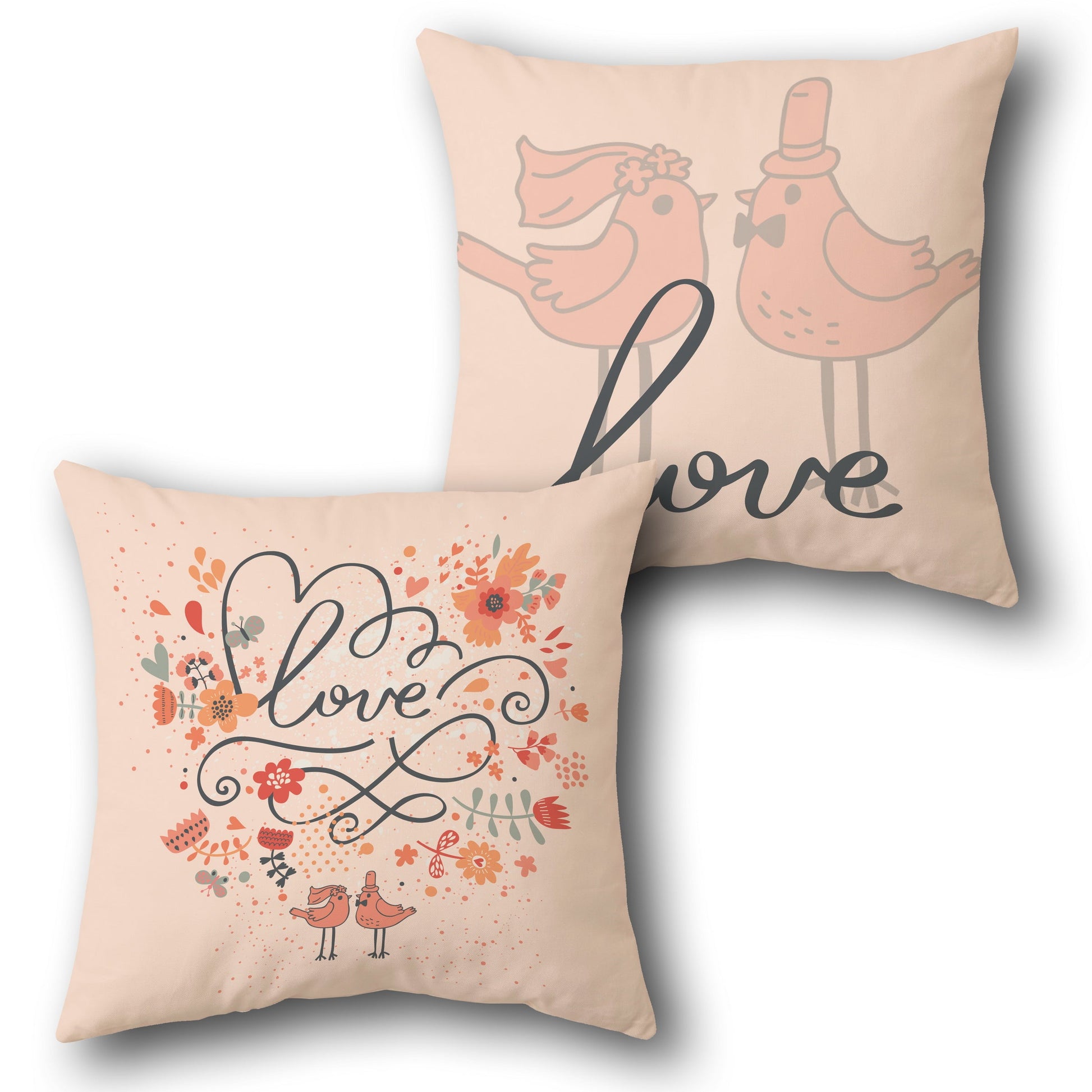 This romantic Love Birds Cushion features peach-colored . One Cushion showcases a pair of adorable birds dressed as a bride and groom, while the other displays the word "LOVE" in elegant black script, surrounded by a whimsical floral wreath in shades of orange, red, and green, with small birds at the base. These are perfect for adding a touch of love and charm to any space, ideal for romantic decor, bedrooms, or as a thoughtful gift.