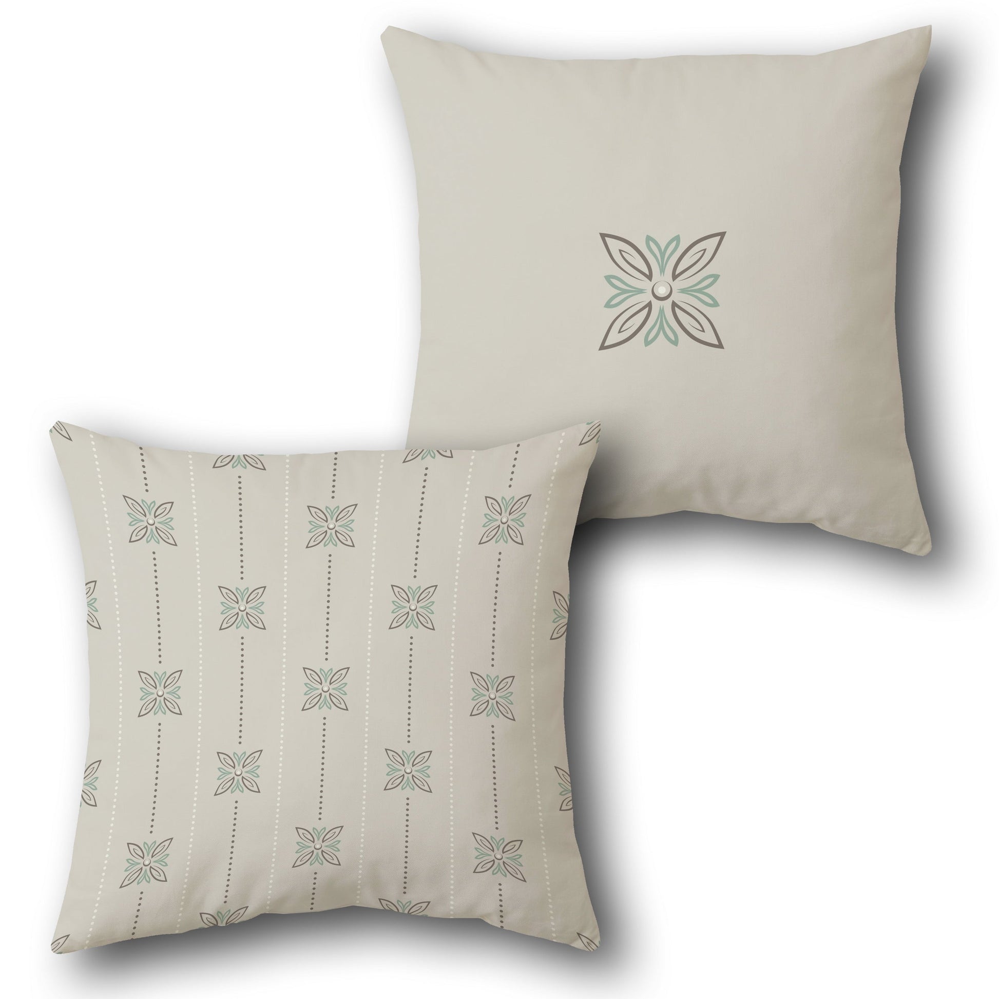This cushion features a dual-sided design with a subtle floral theme. The front displays a minimalist pattern of small, stylized flowers in teal and brown, arranged in vertical rows with dotted lines on a cream base, creating a delicate and understated look. The back features a single larger flower in the same teal and brown tones centered on a plain cream background, offering a clean and simple contrast. The soft cream base paired with teal and brown accents gives it a calm, natural vibe.