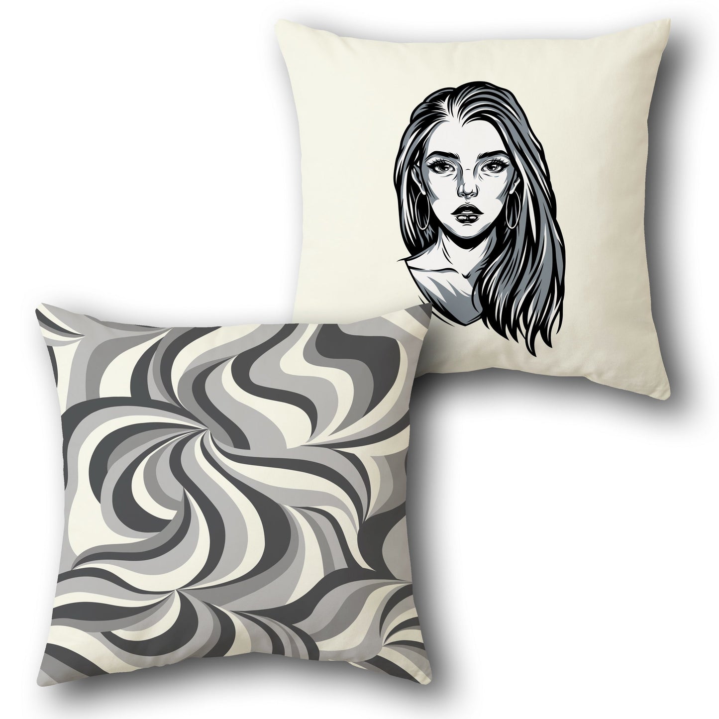 Add artistic flair to your décor with the Monochrome Muse & Swirl Throw Cushion. One Cushion showcases a striking illustrated portrait of a woman on a soft cream background, radiating modern elegance and expressive design. The companion Cushion features a captivating swirl pattern in grayscale tones, offering a sleek and sophisticated visual texture. Perfect for adding a bold yet refined statement to any room.