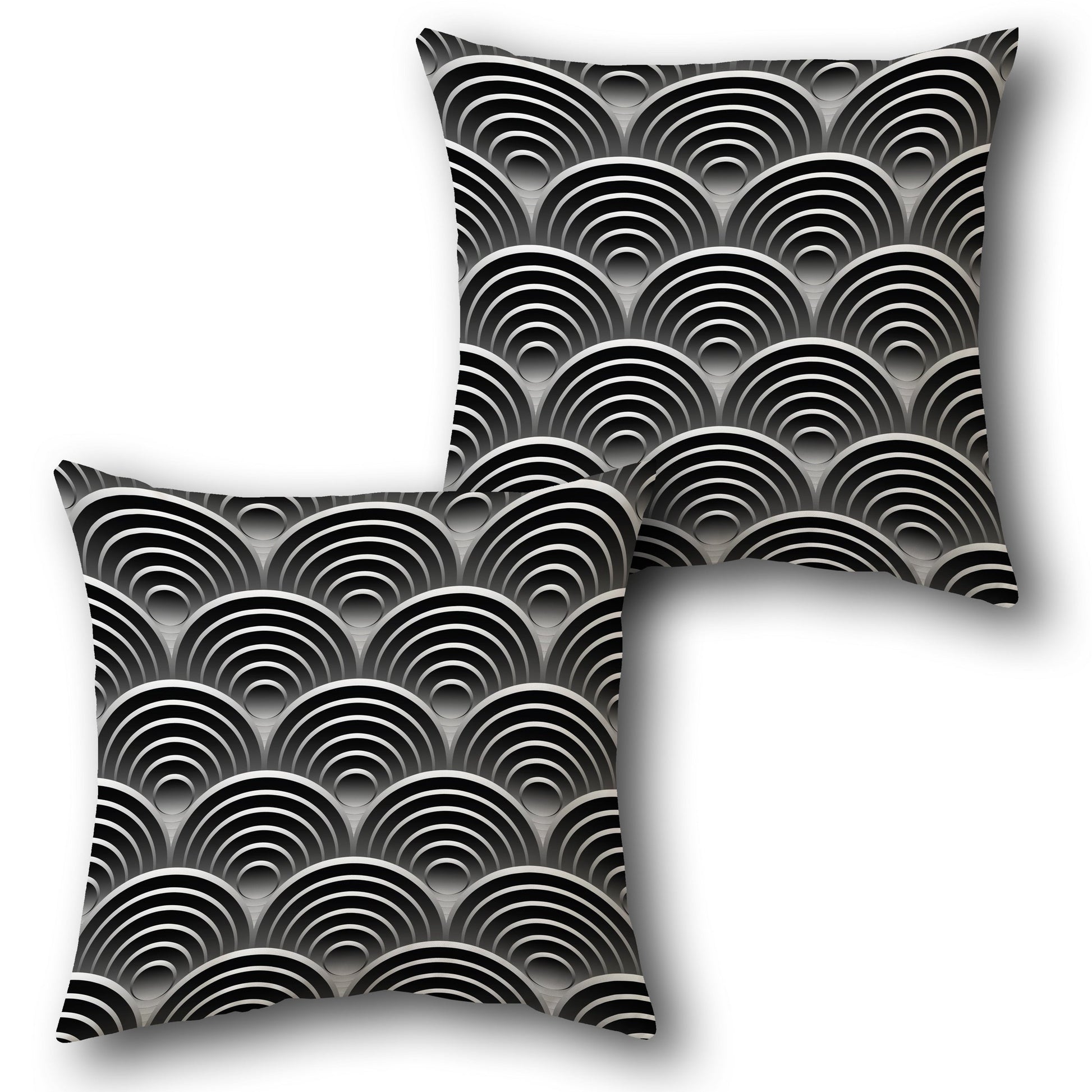 Enhance your decor with this of 2 throw Cushions featuring a captivating wave pattern. The design displays concentric semi-circles in shades of black, gray, and white, creating a sleek, modern look with a white base color. Ideal for adding a minimalist yet sophisticated touch to your living room, bedroom, or office space.