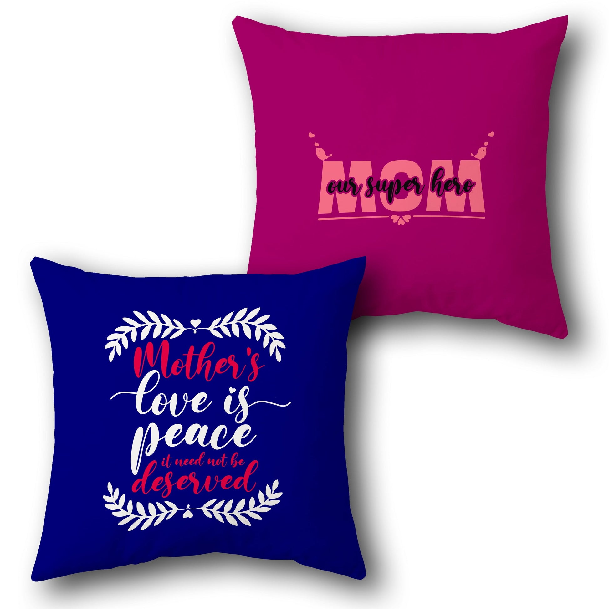 This single cushion features a touching tribute to mothers with a front and back print. The front side has a deep blue (neela shade) base with the text "Mother's LOVE IS PEACE it need not be DESERVED" in white and red cursive, framed by a white leaf border with heart accents. The back side has a magenta (gulabi shade) base with the text "MOM OUR SUPER hero" in pink, accented with small hearts and birds. Perfect for honoring moms with a loving decor piece.