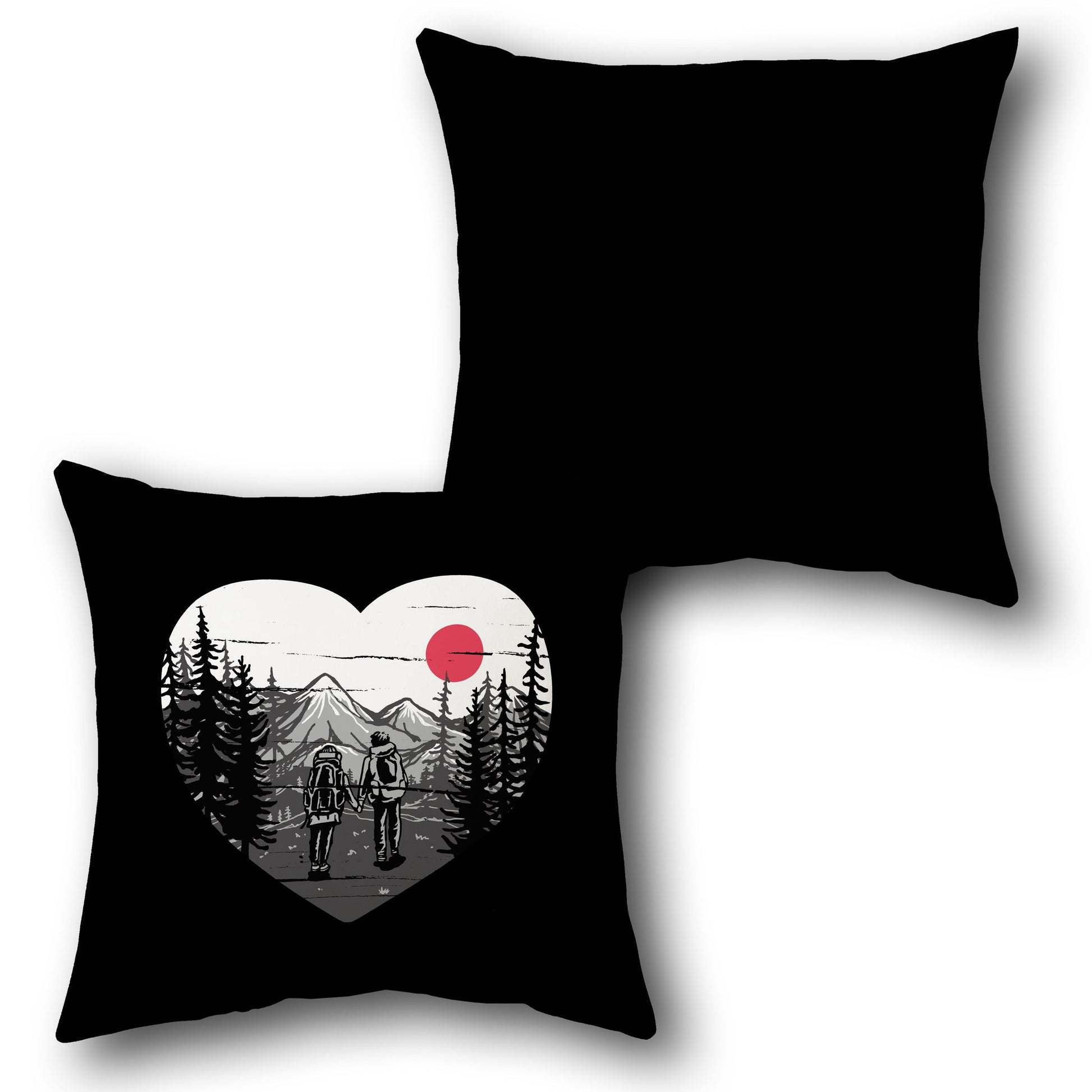 Celebrate love and the great outdoors with this romantic and scenic Cushion design . One side features a heart-shaped illustration of a couple hiking hand-in-hand through a pine forest, with majestic mountains and a red sun in the background. The other side is solid black, offering a minimalist contrast. This Cushion is perfect for nature lovers, hikers, or couples who share a passion for adventure.