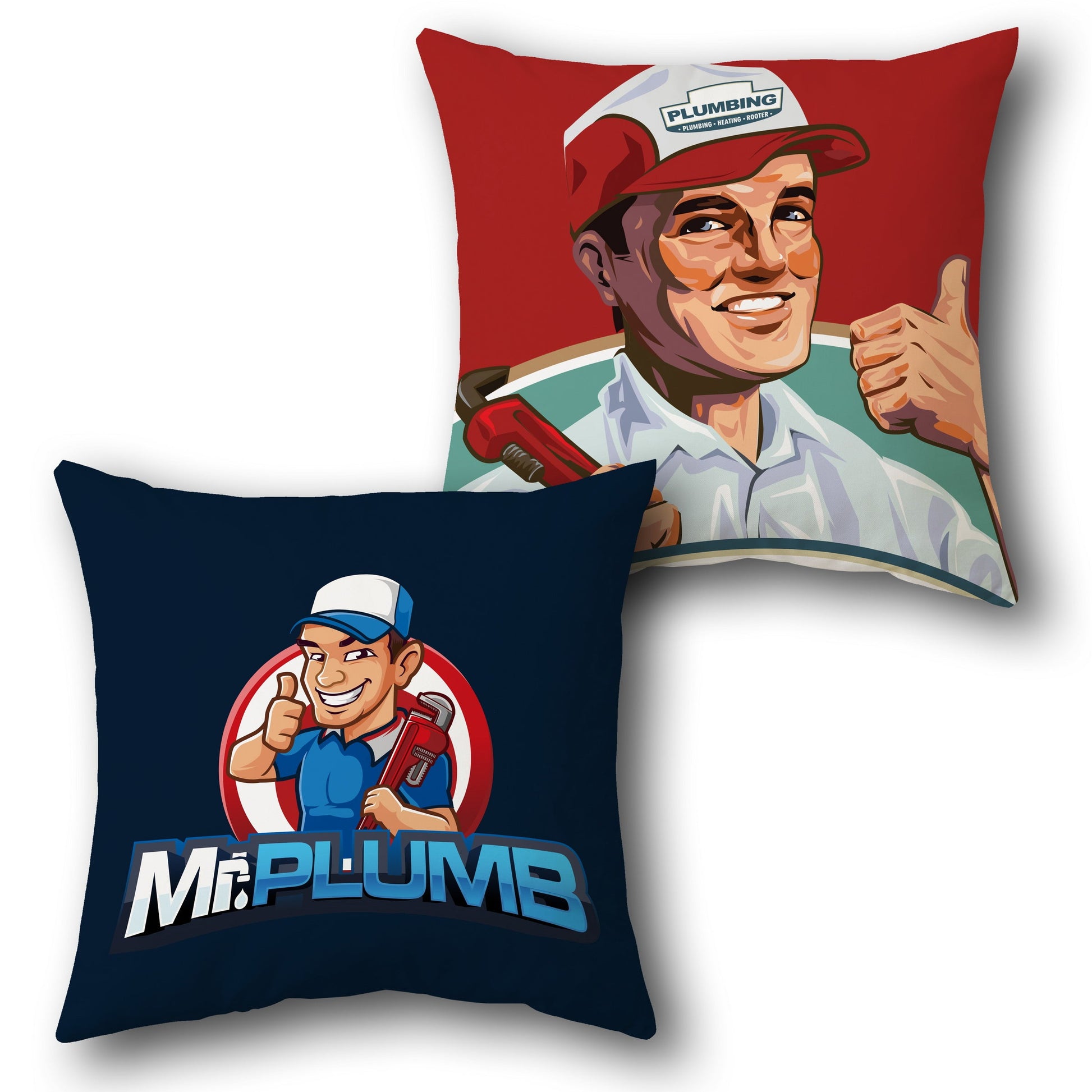 This single cushion features a plumber-themed design on both sides. The front showcases a cartoon plumber with a wrench, giving a thumbs-up, with "MR PLUMBER" text, set against a dark blue base color with a red circle accent. The back depicts a retro-style plumber in a cap, also giving a thumbs-up, holding a wrench, on a red base color with a teal background. The dark blue and red base colors create a vibrant, professional contrast.