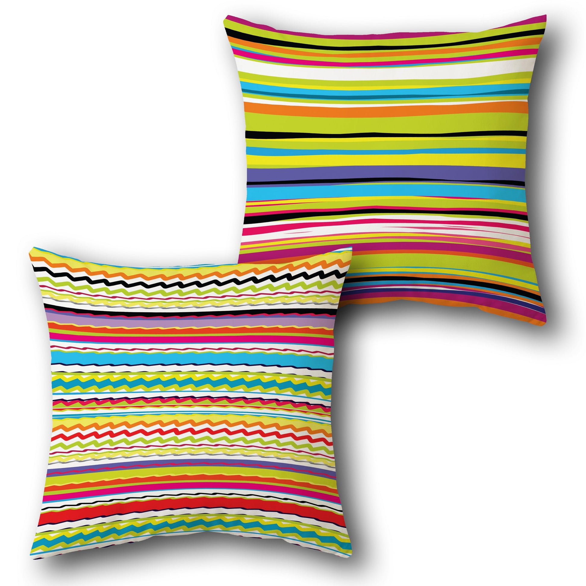 Add a burst of energy to your space with the Multicolor Vibrant Stripes Decorative Cushion . This of square Cushions features a dynamic pattern of horizontal stripes in a variety of colors including red, orange, yellow, green, blue, purple, and black. One Cushion showcases straight stripes, while the other has a playful zigzag pattern, creating a lively contrast. Perfect for bringing a bold and cheerful vibe to your sofa, bed, or chair.