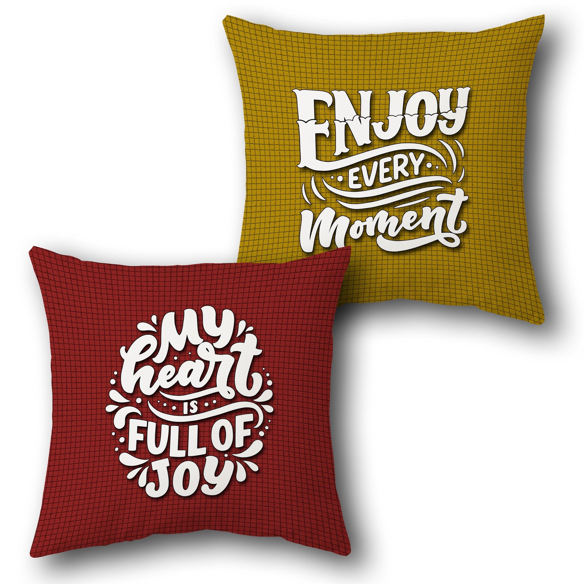 This cushion spreads positivity with its heartfelt design. The front side features a deep maroon base color with a subtle checkered pattern and the text "MY HEART IS FULL OF JOY" in white, accented by decorative flourishes. The back side has a mustard yellow base color with a matching checkered pattern and "ENJOY EVERY MOMENT" written in white. A perfect addition to bring warmth and cheer to any space.