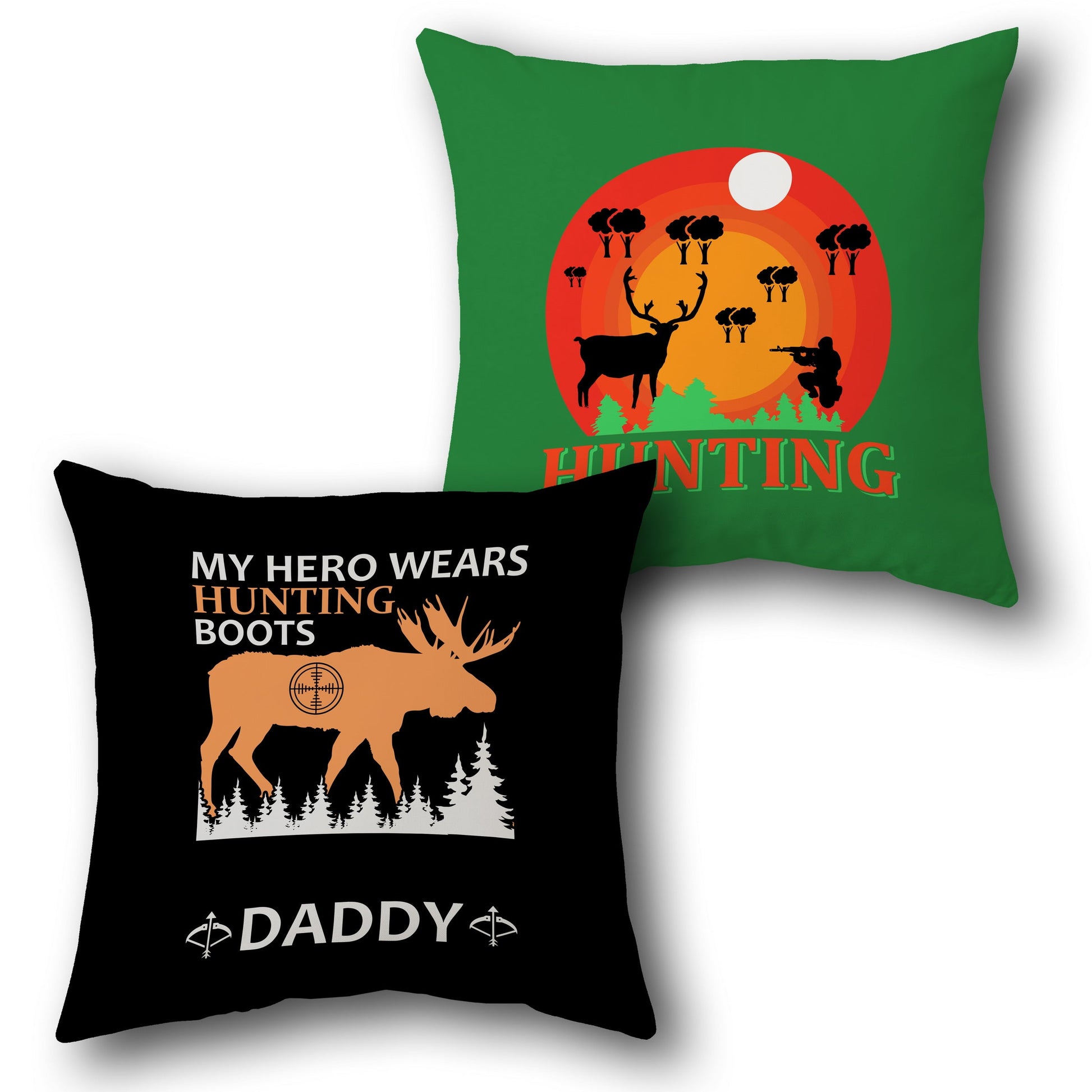 This single square cushion celebrates a hunting enthusiast dad with a rugged design on both sides. The front side has a black base color with the text "MY HERO WEARS HUNTING BOOTS" in orange and white, featuring an orange moose with a target on it, set against a silhouette of trees and the word "DADDY" framed by arrows. The back side has a green base color with a hunting scene in black, orange, and red, showing a hunter, a deer, and trees against a sunset, with the word "HUNTING" in red. Ideal for outdoor lovers and dads who hunt.