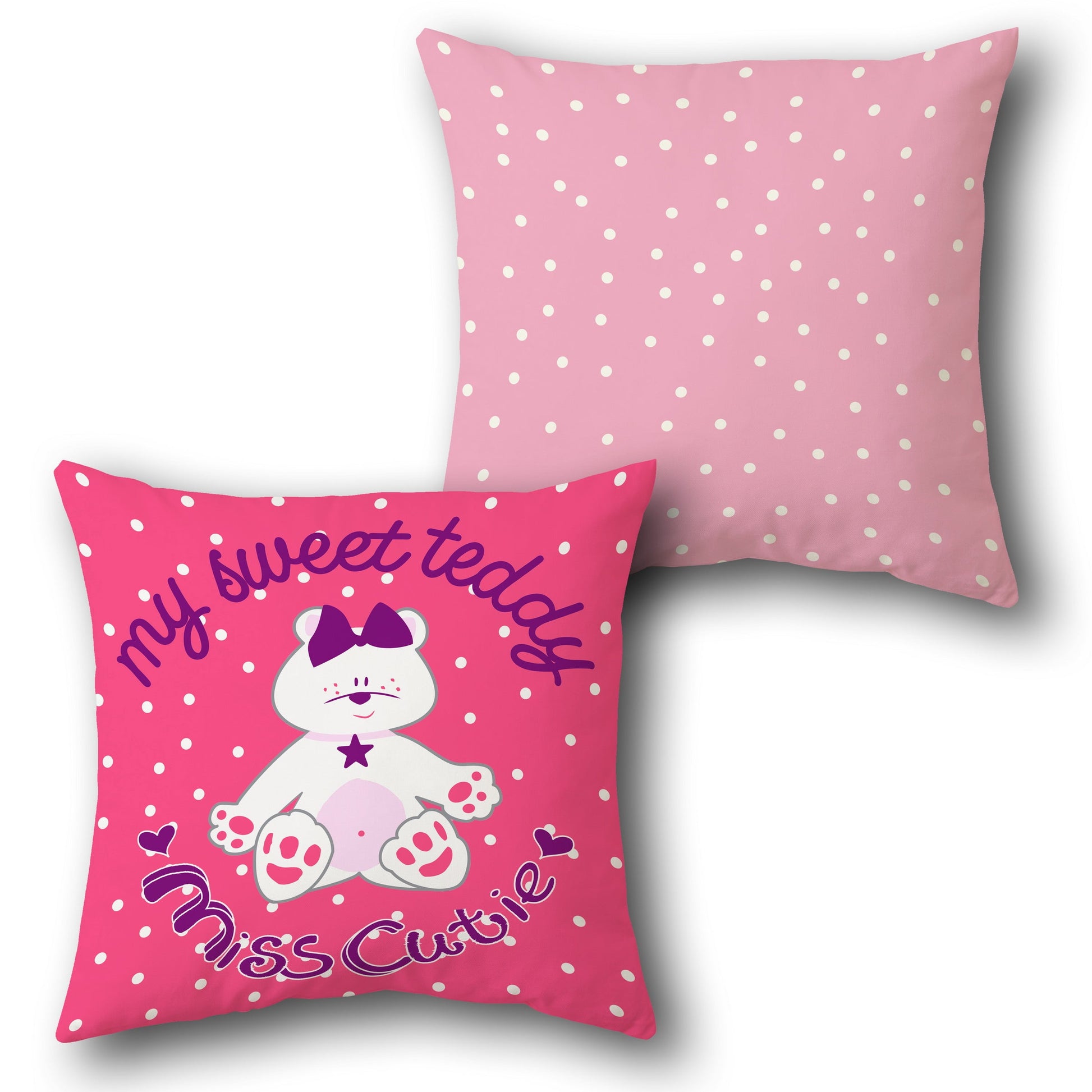 This adorable cushion features a cute teddy bear with a purple bow and a star on its belly, accompanied by the text "My Sweet Teddy Miss Cutie" in purple lettering with small pink hearts. The design is set against a bright pink base color with white polka dots on both sides, creating a playful and endearing look perfect for a cozy space.