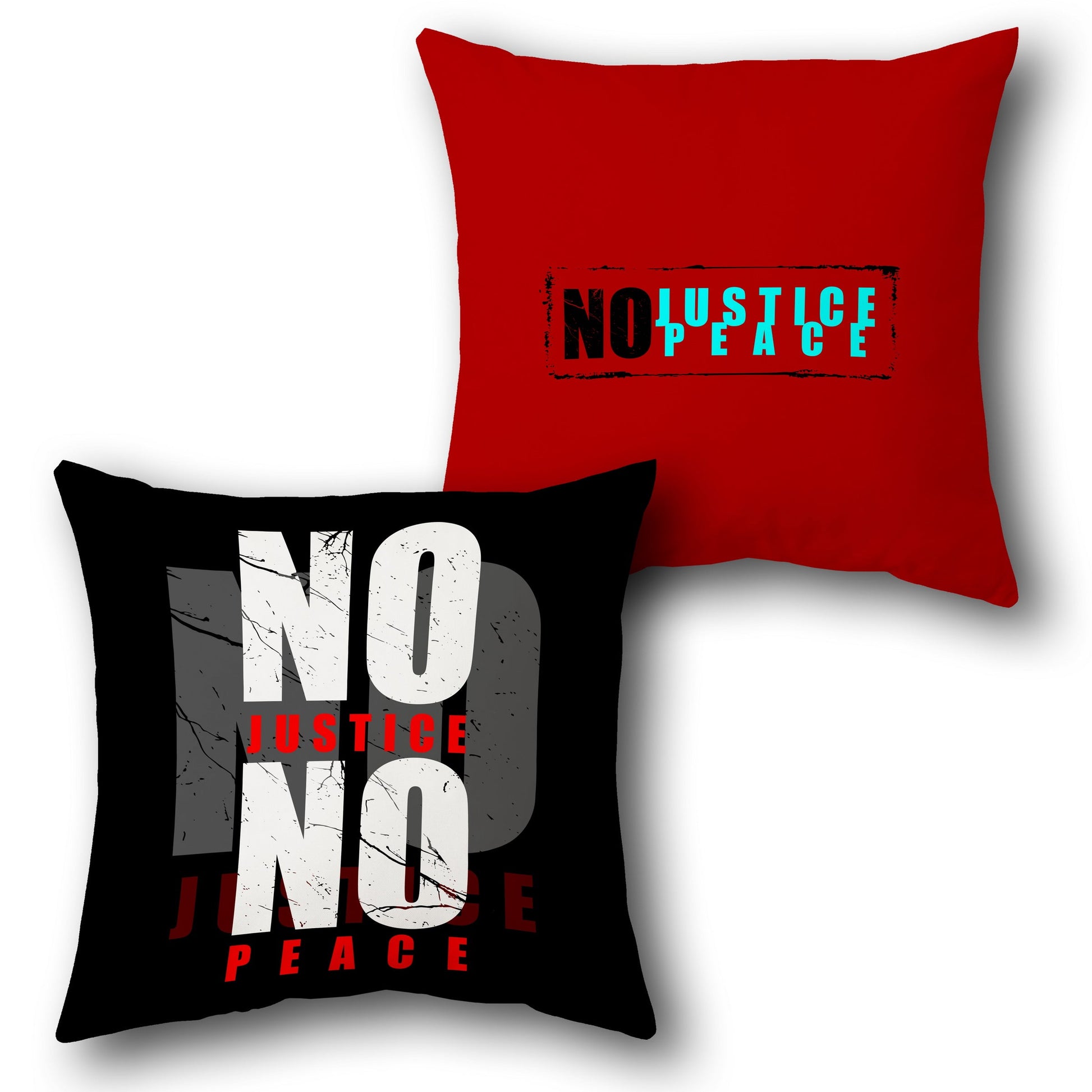 This powerful cushion features the bold statement "NO JUSTICE NO PEACE" on the front, set against a solid black base color. The text is in large white letters with a distressed effect, and "JUSTICE" and "PEACE" are highlighted in red for emphasis. The back has a solid red base color with the same "NO JUSTICE NO PEACE" text in black and cyan, reinforcing the message.