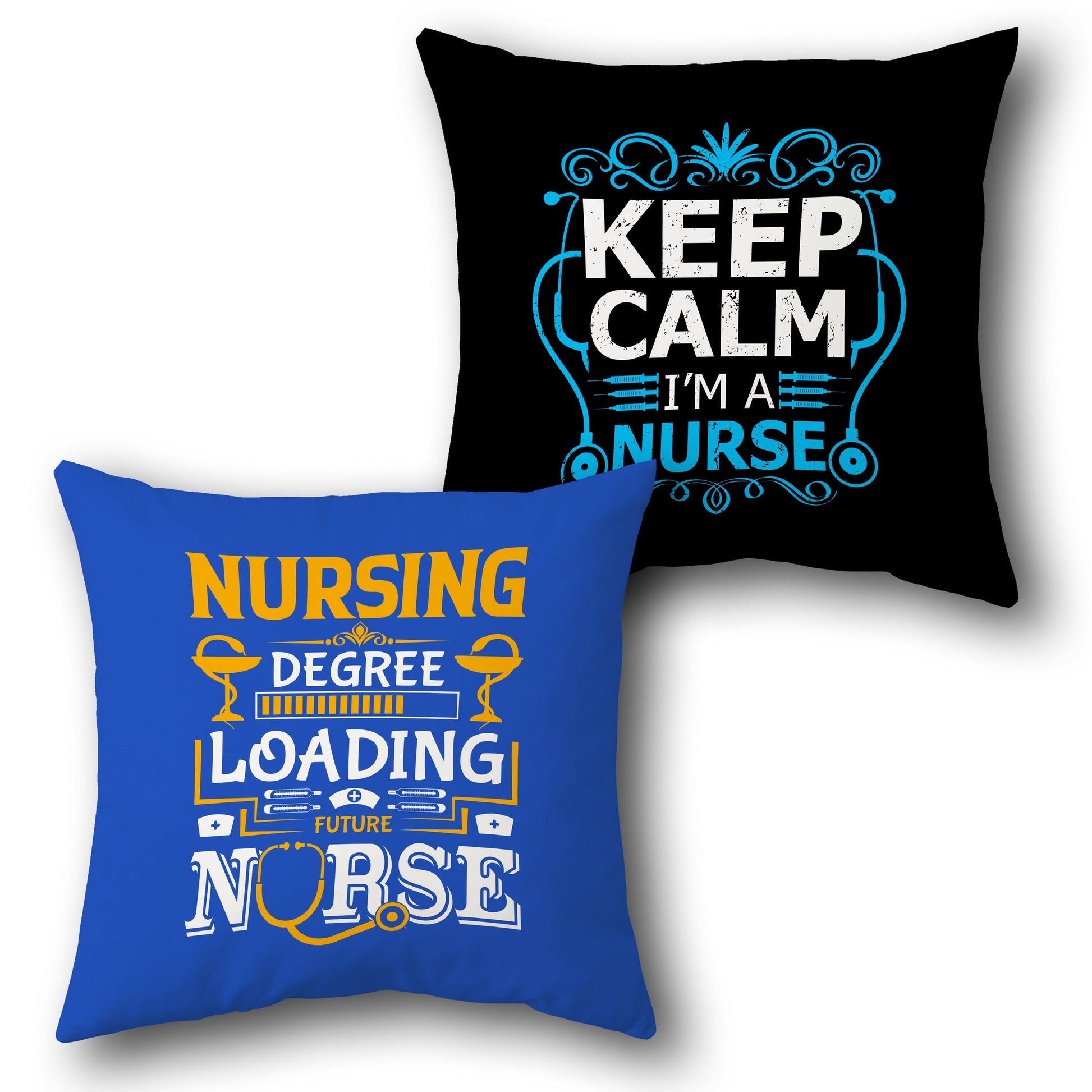 Celebrate the dedication and passion of nurses with the Nurse Life Motivation Cushion . This empowering pair features bold typography and fun medical-themed designs. One Cushion reads “KEEP CALM I’M A NURSE” in bright blue on a black background, radiating confidence and pride. The second showcases a vibrant “NURSING DEGREE LOADING FUTURE NURSE” message in yellow, white, and blue on a royal blue base—perfect for students or recent grads. A great gift for nurses, nursing students, or anyone in the healthcare field.