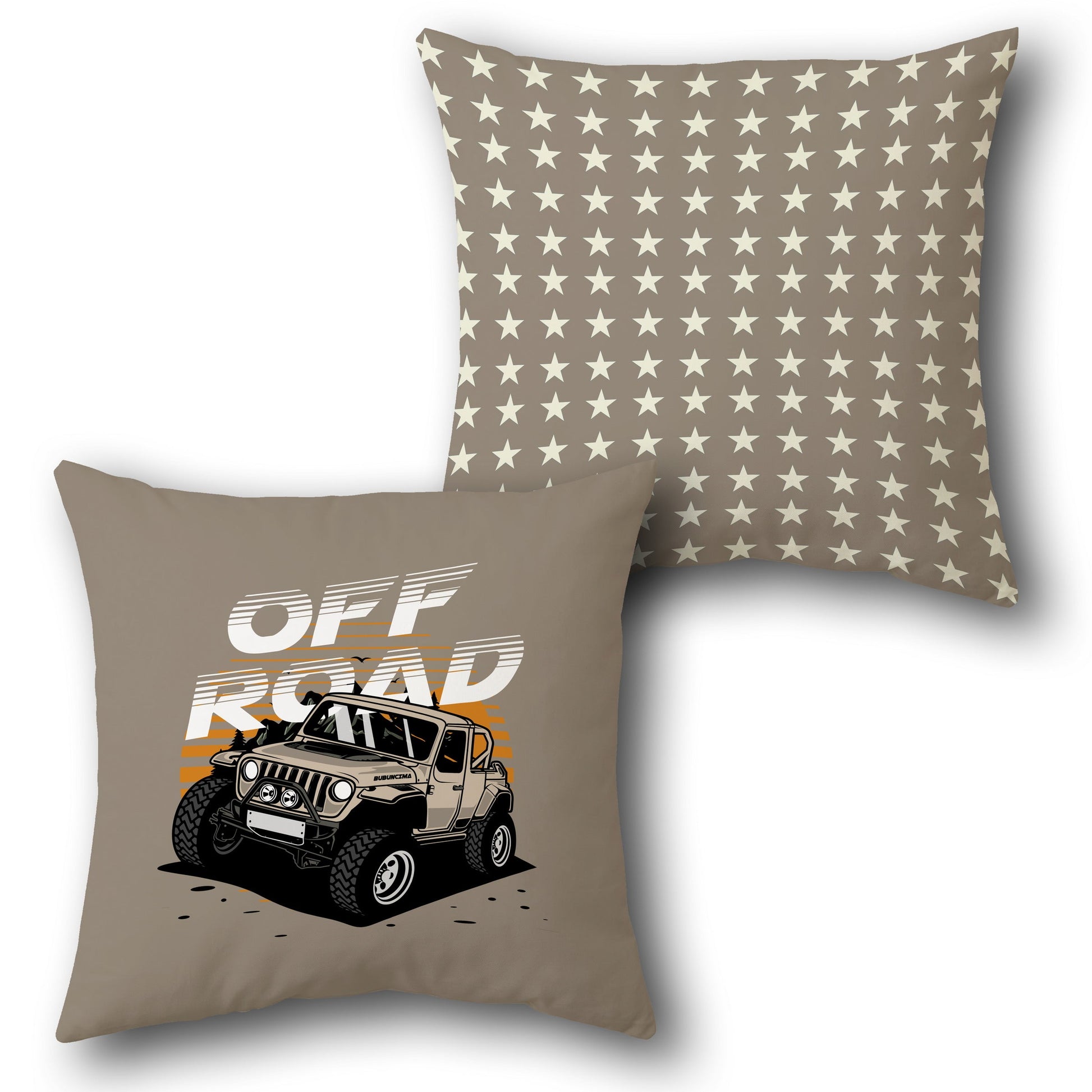 This rugged Cushion features an adventurous off-road vehicle, with the bold "OFF ROAD" lettering and a dynamic orange accent. The reverse side showcases a subtle star pattern on a neutral beige background. The design captures the thrill of off-road exploration, making it perfect for outdoor enthusiasts, adventure lovers, or anyone looking to add a bit of adventure to their living space.