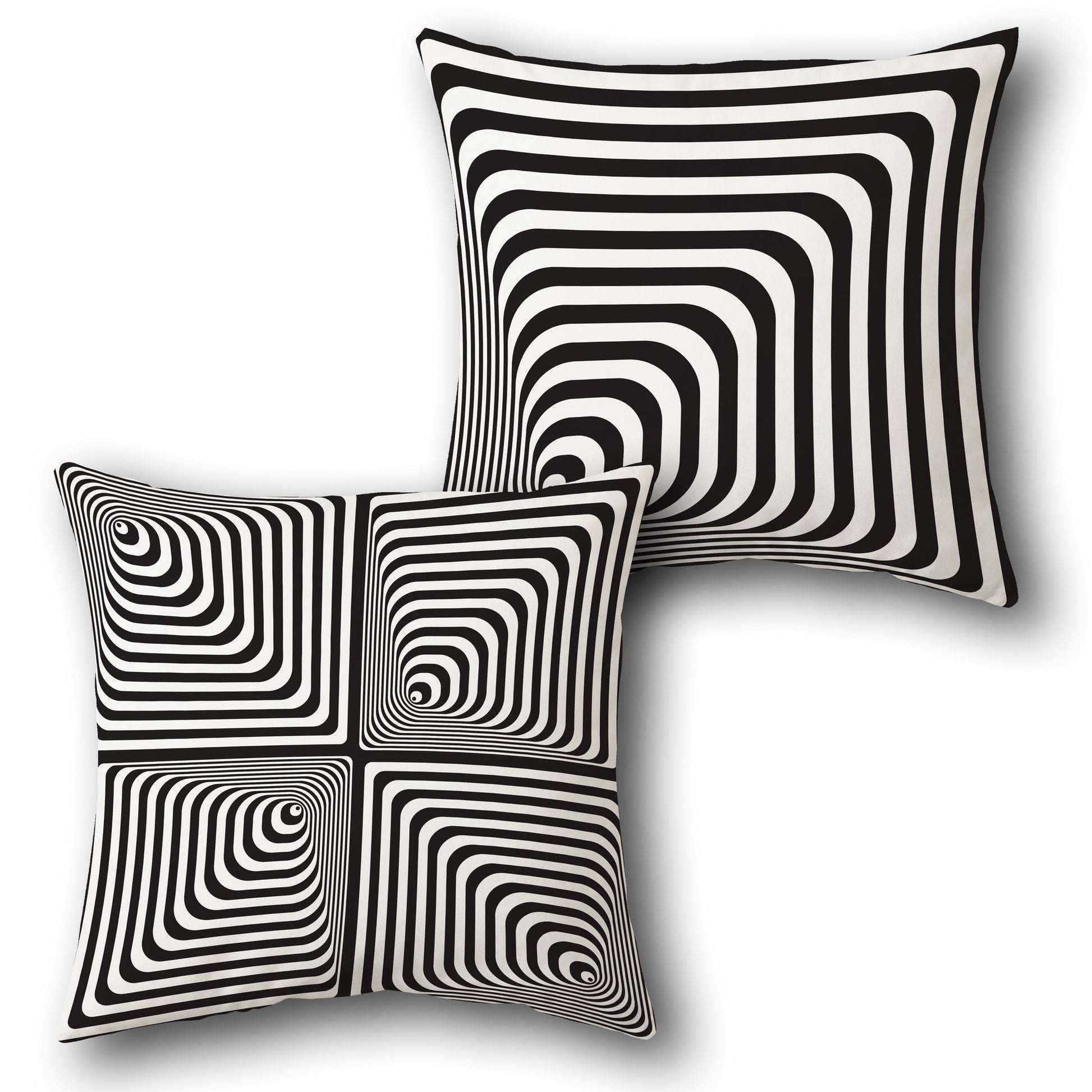 A two square throw Cushions featuring mesmerizing black and white optical illusion patterns. The top Cushion showcases a hypnotic spiral design, while the bottom Cushion displays a quad-tunnel effect, creating a bold and modern statement for any living space.