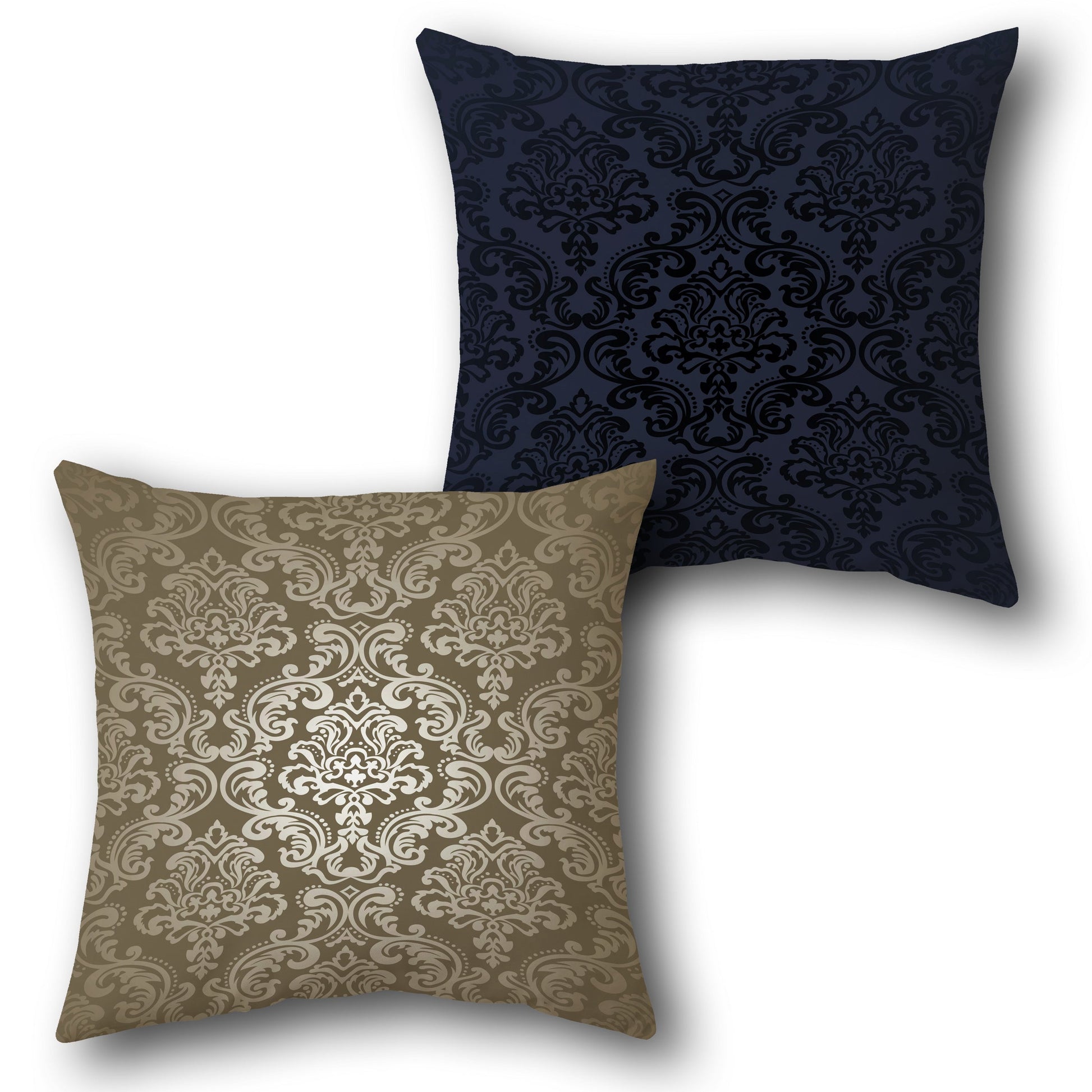 This luxurious Cushion includes square Cushions, one with a taupe base color and the other with a deep navy base color, both featuring an ornate damask pattern in white with intricate swirls and flourishes on the front. The back of each Cushion mirrors the base color of the front, creating a regal and timeless look for your home decor.