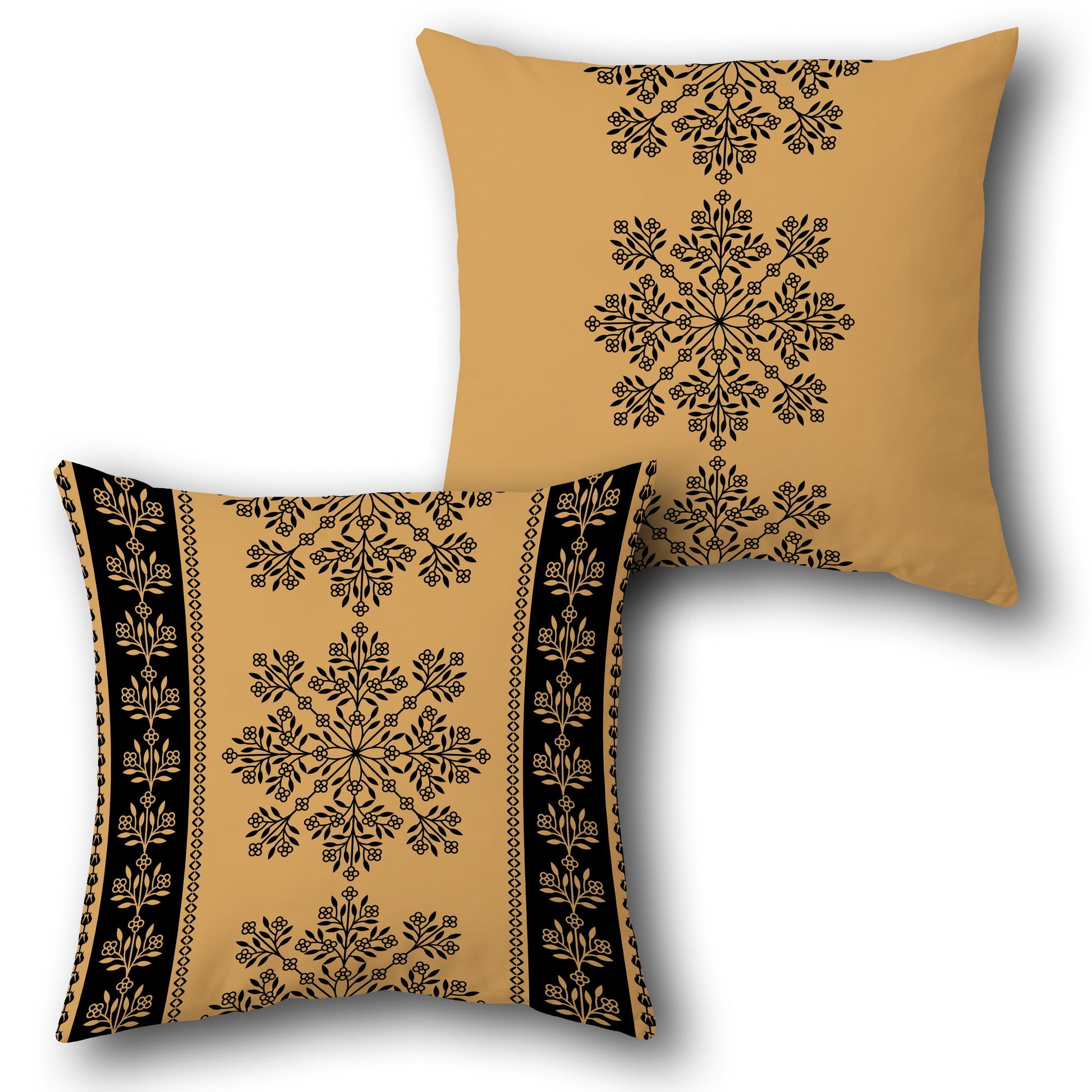 This cushion features an intricate mandala-inspired design on the front, with detailed floral and geometric patterns in black, set against a mustard yellow background, resembling the desi color "peela." The design is framed by vertical borders with smaller floral motifs. The back has a simpler version with three mandala motifs in the same black and mustard yellow combination, creating a balanced contrast. The base color of the cushion is mustard yellow.