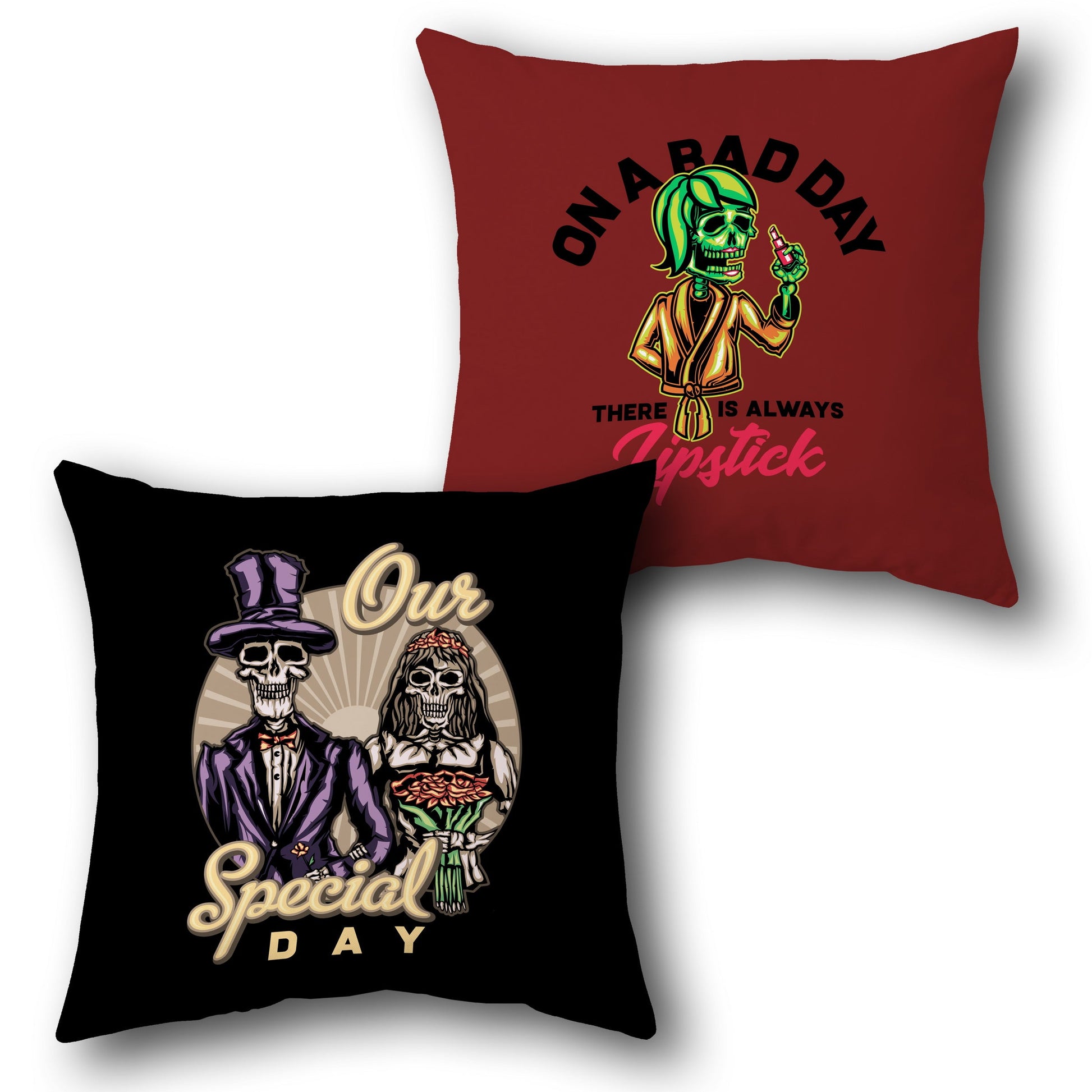 This single cushion features a quirky front and back design. The front side has a black base with an illustration of two skeletons in wedding attire—one in a purple (baingani) suit and the other in a white dress with red (laal) flowers and green (hara) leaves—against a beige background, with beige text that reads "OUR SPECIAL DAY." The back side has a deep red base color (laal) with white, green (hara), and pink (gulabi) text saying "ON A BAD DAY THERE IS ALWAYS LIPSTICK," paired with an illustration of a skeleton applying lipstick. Ideal for those who love a mix of humor and gothic style in their decor.