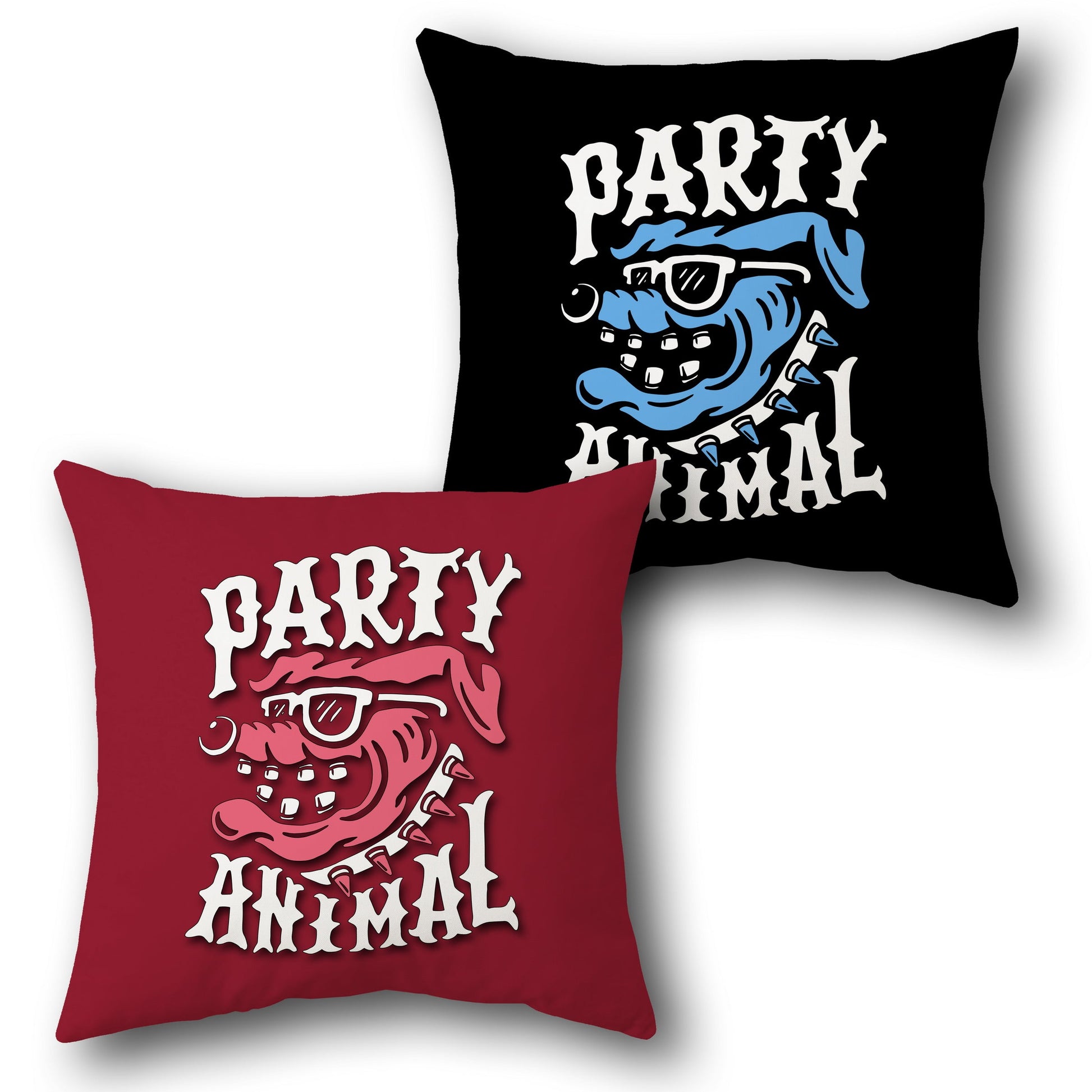 This playful cushion features the text "PARTY ANIMAL" in bold white on both sides, with a cartoonish dog wearing sunglasses and a spiked collar. The front side has a deep red base color, while the back side has a black base color. The dog illustration is pink on the red side and blue on the black side, adding a fun vibe for party lovers.