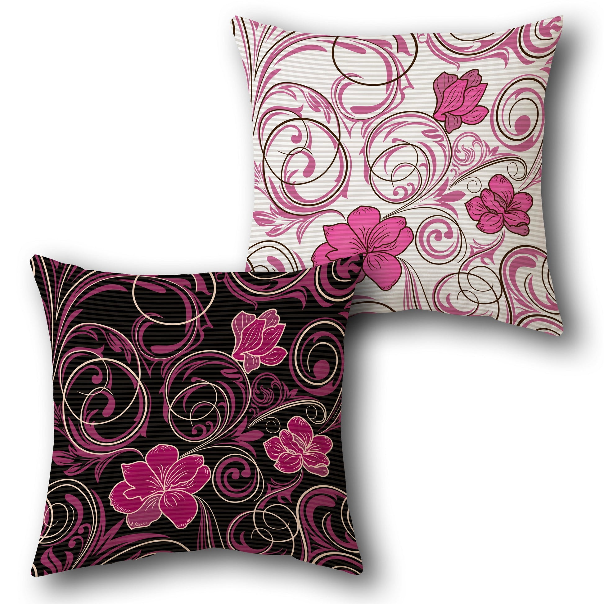 This cushion features a delicate floral swirl pattern with pink flowers and swirling vines on a black base on the front, creating an elegant contrast. The back showcases the same pattern on a white base, offering a lighter and softer look.