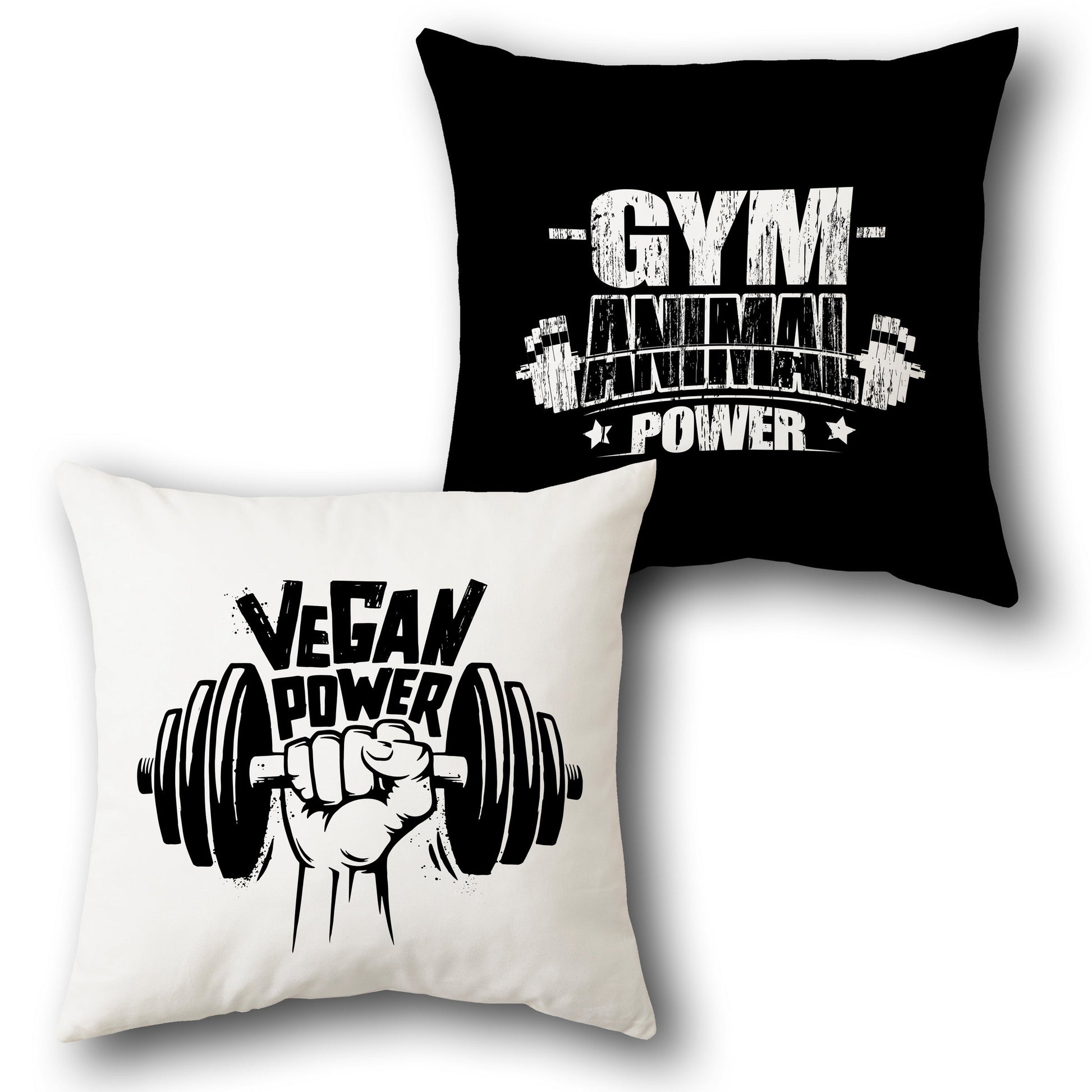 Unleash strength with a purpose through this bold dual Cushion . One cushion features a monochrome design reading “GYM ANIMAL POWER” on a solid black base—ideal for hardcore lifters. The second Cushion, on a clean white base, declares “VEGAN POWER” with a clenched fist lifting a dumbbell, celebrating cruelty-free strength and ethical fitness. This is perfect for gym-goers who train hard and live consciously.