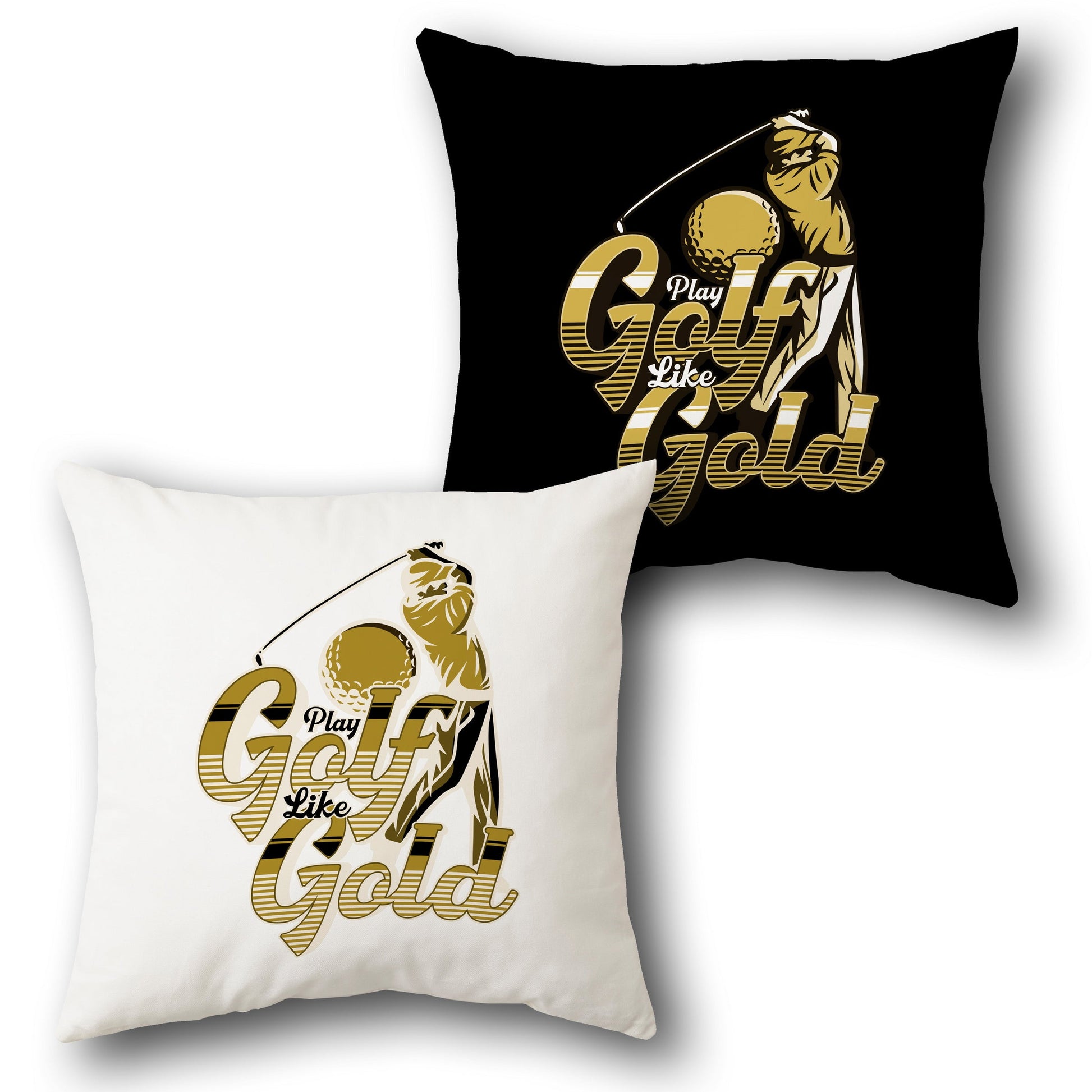 This stylish cushion features a golf-themed design with the text "Play Like Gold" in bold, cursive gold lettering. The cushion showcases a golfer swinging a club with a golf ball illustration integrated into the design. It comes in two color variants: one with a white base and gold accents, and the other with a black base and gold accents. Perfect for golf enthusiasts looking to add a sporty touch to their decor.