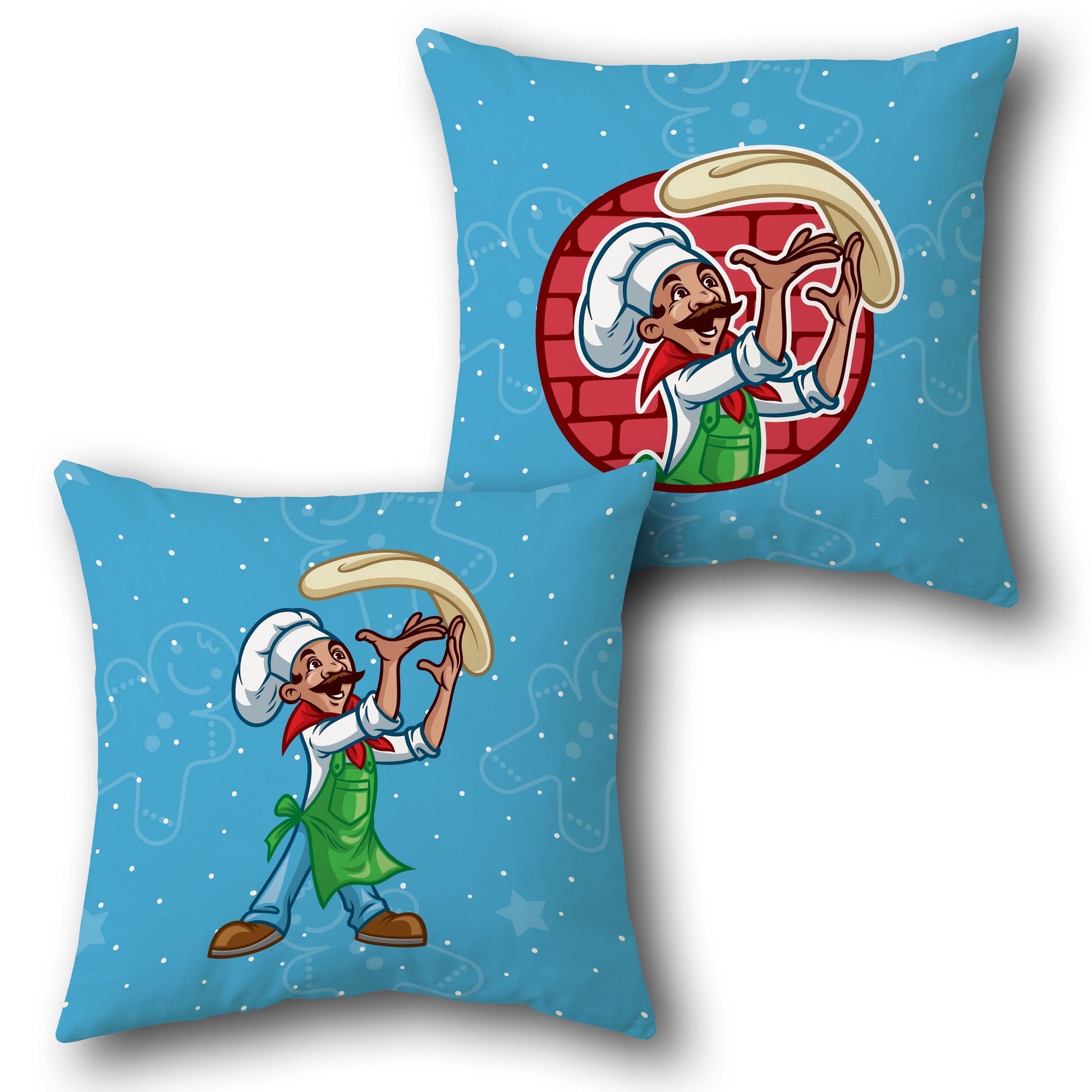 This fun Cushion features a cheerful chef tossing pizza dough with a big smile on his face, against a bright blue background with playful star and gingerbread motifs. The lively design brings a sense of joy and warmth to your space, perfect for any pizza lover or someone looking to add a fun, whimsical touch to their kitchen or living room.