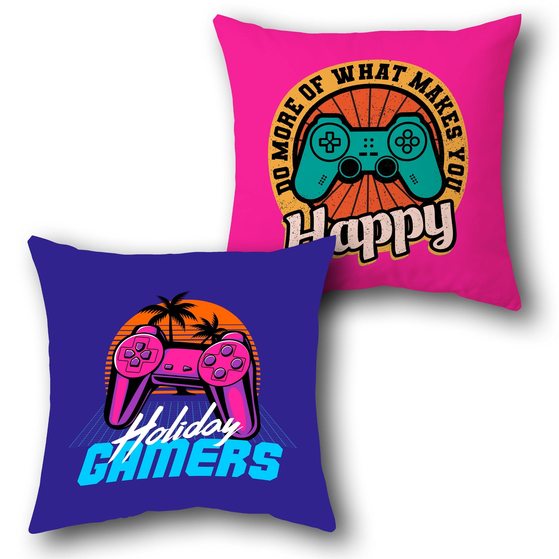 Level up your space with this bold and colorful single cushion featuring vibrant retro gaming artwork on both sides. The front side rocks a vintage-style controller with the phrase “Holiday Gamers” on a cool electric blue base and sunset graphic – giving total retro beach vibes. The back side features a teal game controller with the uplifting quote: “Do More of What Makes You Happy” on a hot pink (Desi Gulabi) background.