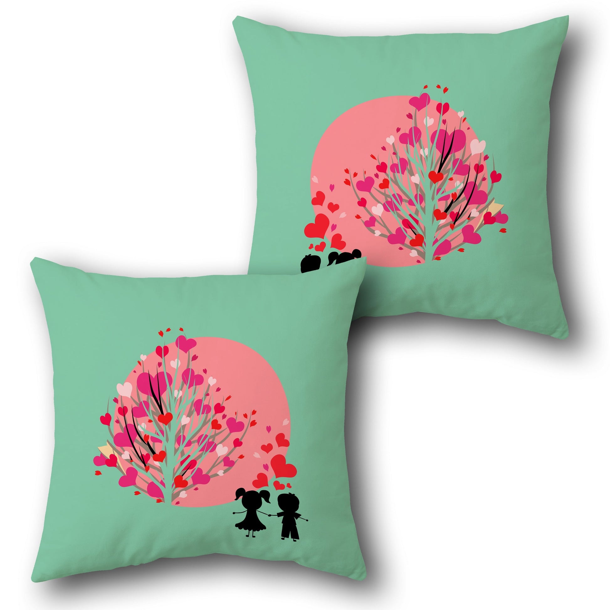 This charming throw Cushion features a romantic design of a tree with branches forming a heart shape, filled with pink and red hearts against a soft pink circular background. Below the tree, silhouettes of a boy and girl holding hands add a sweet touch. The base color is a calming teal, creating a lovely contrast with the warm tones of the hearts. Perfect for adding a touch of romance to your living room, bedroom, or cozy nook.