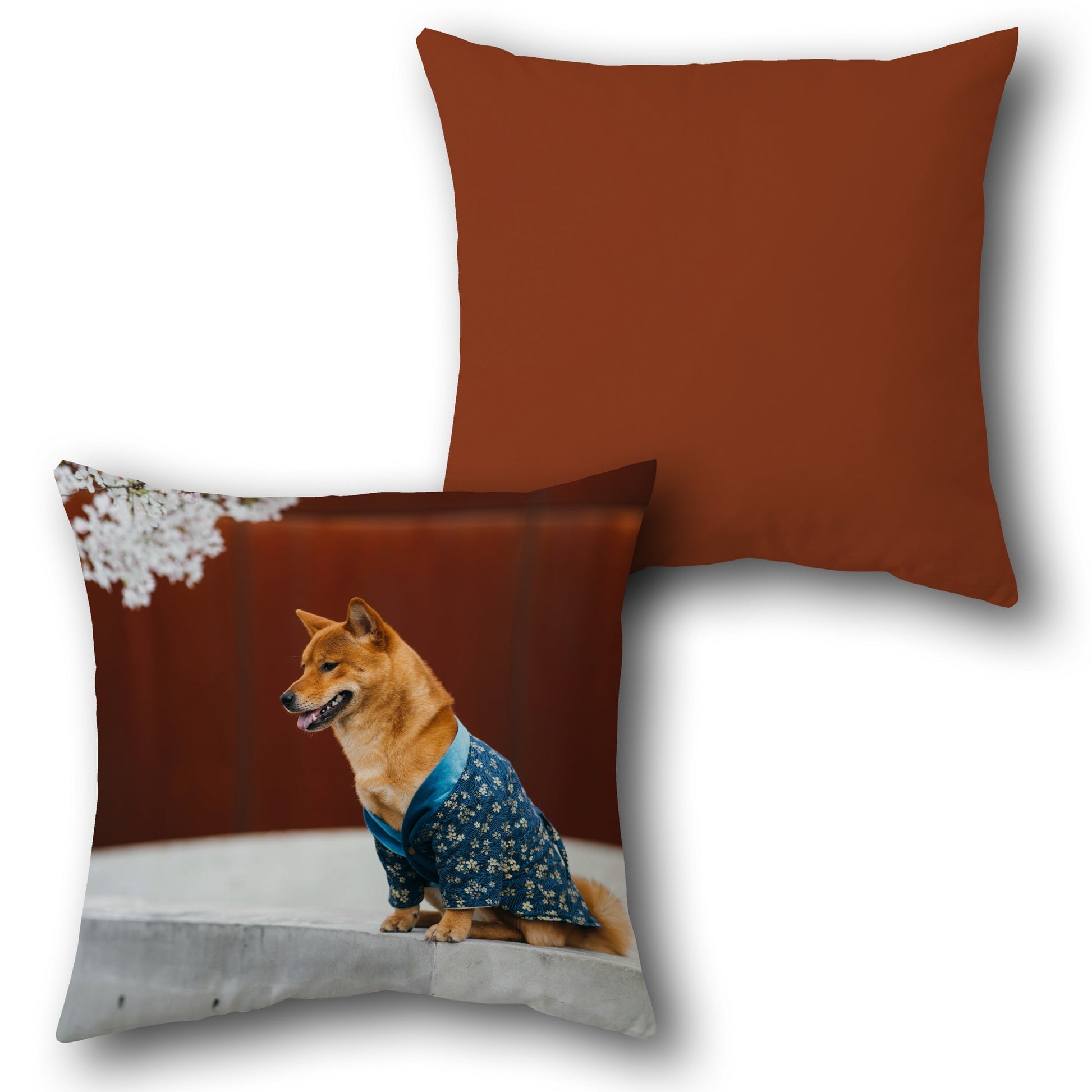 Celebrate canine charm with this Shiba Inu Kimono Cushion, featuring a Shiba Inu in a blue floral kimono against a rustic brown background. The soft fabric ensures comfort, with a solid rust brown back for a warm look. Perfect for dog lovers or Japanese-inspired decor.