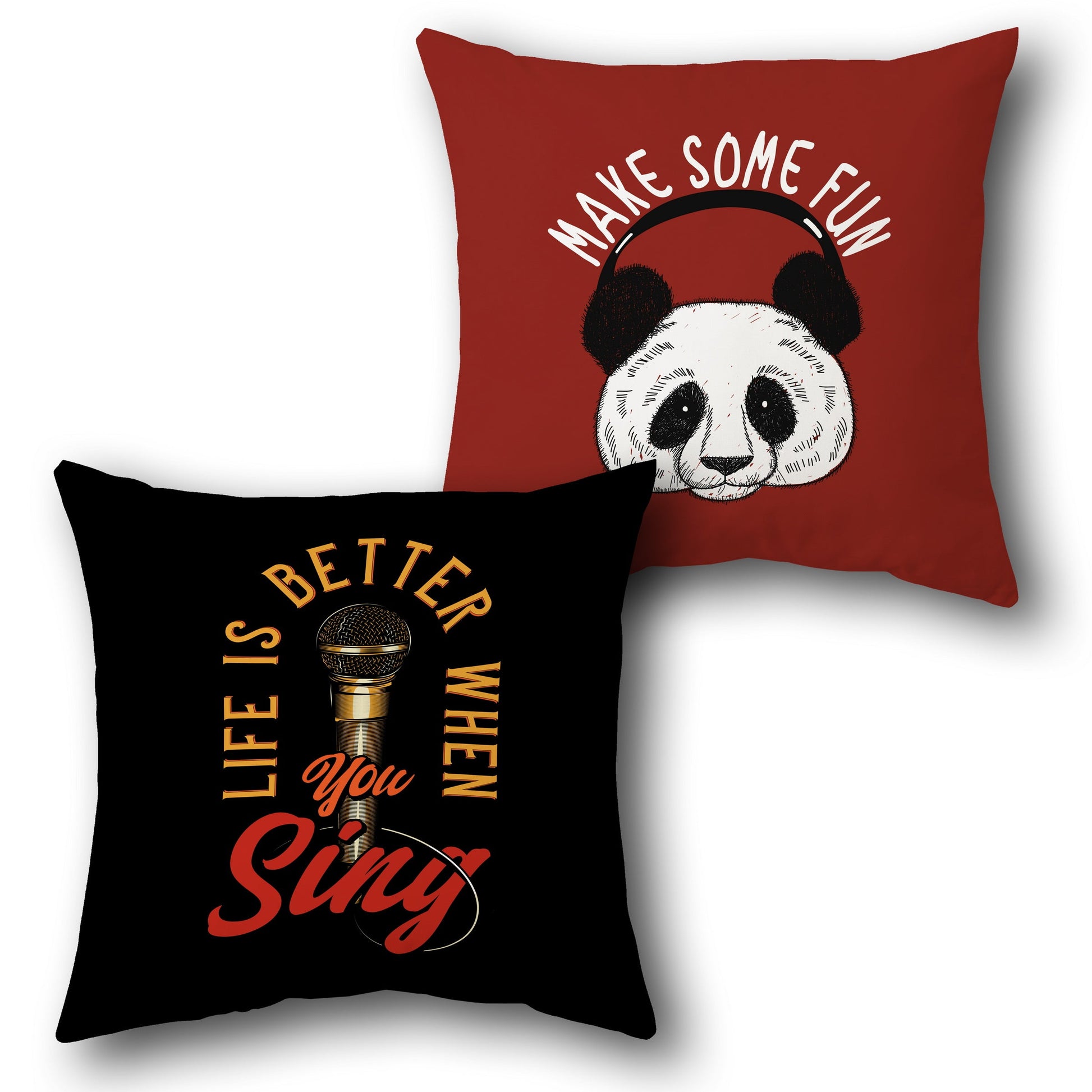 This cushion features a cheerful design with the text "LIFE IS BETTER WHEN YOU SING" on one side and a panda with headphones and "MAKE SOME FUN" on the other. The front side has a black base color with yellow and red text and a microphone graphic, while the back side has a deep red base color with black and white panda illustration.