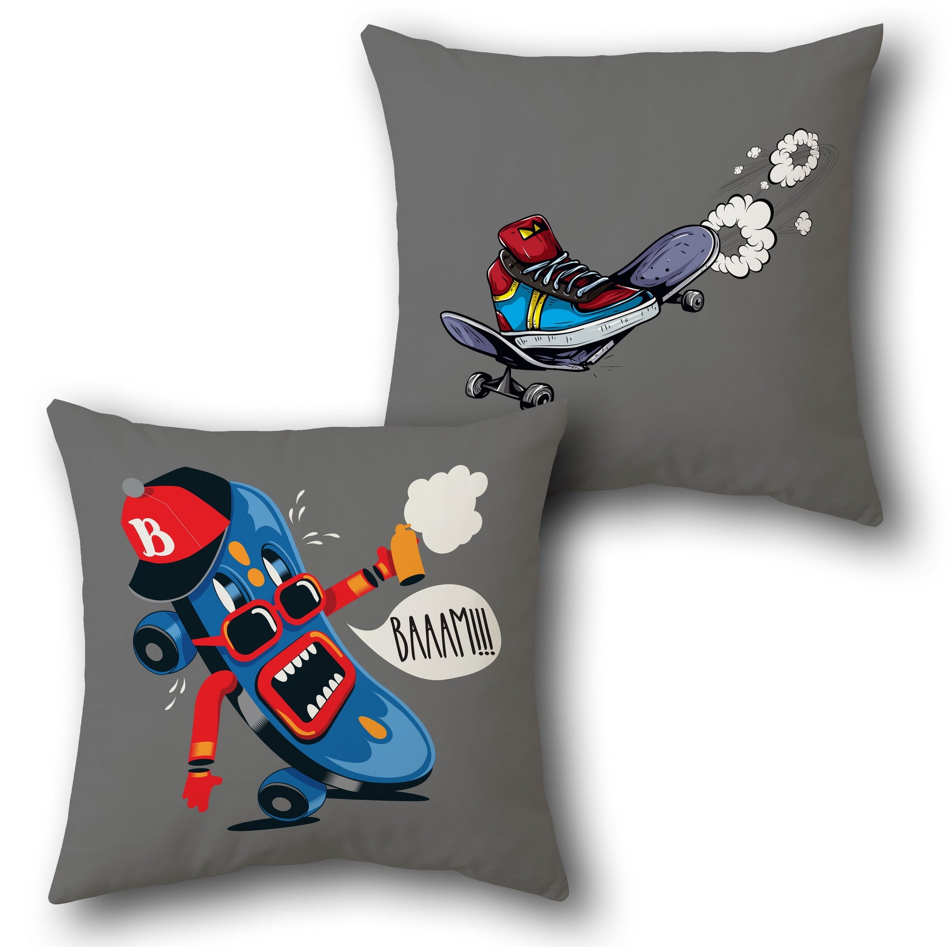 This of two Cushions features a bold skateboard-themed design. The first Cushion showcases a blue anthropomorphic skateboard with a red cap and gloves, holding a spray can with a "BAAAAM!!!" speech bubble, accented by white and yellow details. The second Cushion depicts a red sneaker with blue and yellow accents riding a skateboard, with white motion clouds trailing behind. Cushions have a solid gray base color, making the vibrant designs pop.