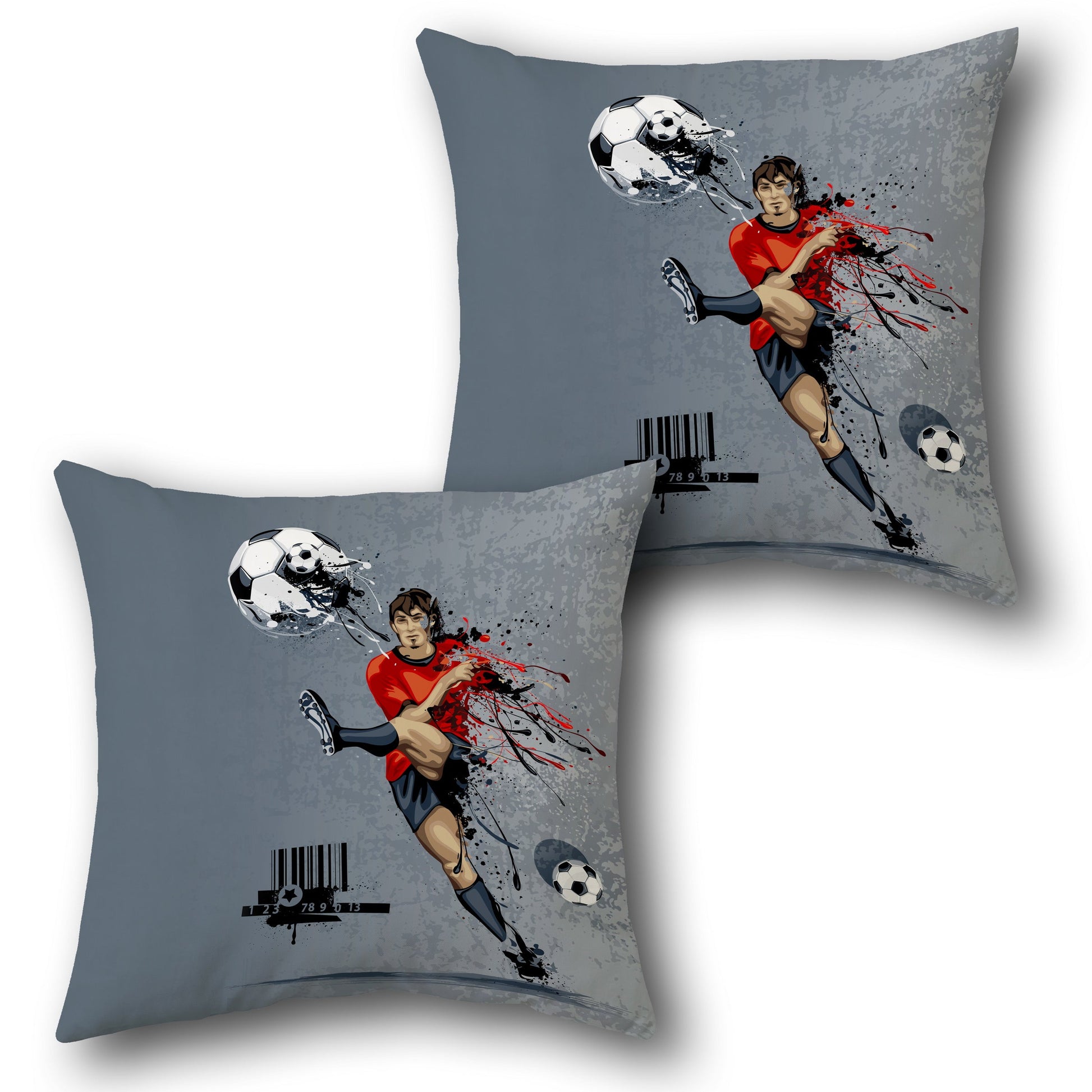 Capture the excitement of the game with this Soccer Player Action Throw Cushion! Featuring a dynamic illustration of a soccer player kicking a ball, this cushion showcases a bold design with splashes of red and black paint effects, symbolizing the intensity of the sport. against a textured grey background, the arrk includes multiple soccer balls and a barcode graphic for an urban edge. Perfect for soccer enthusiasts, this Cushion adds a sporty flair to your bedroom, living room, or game room.