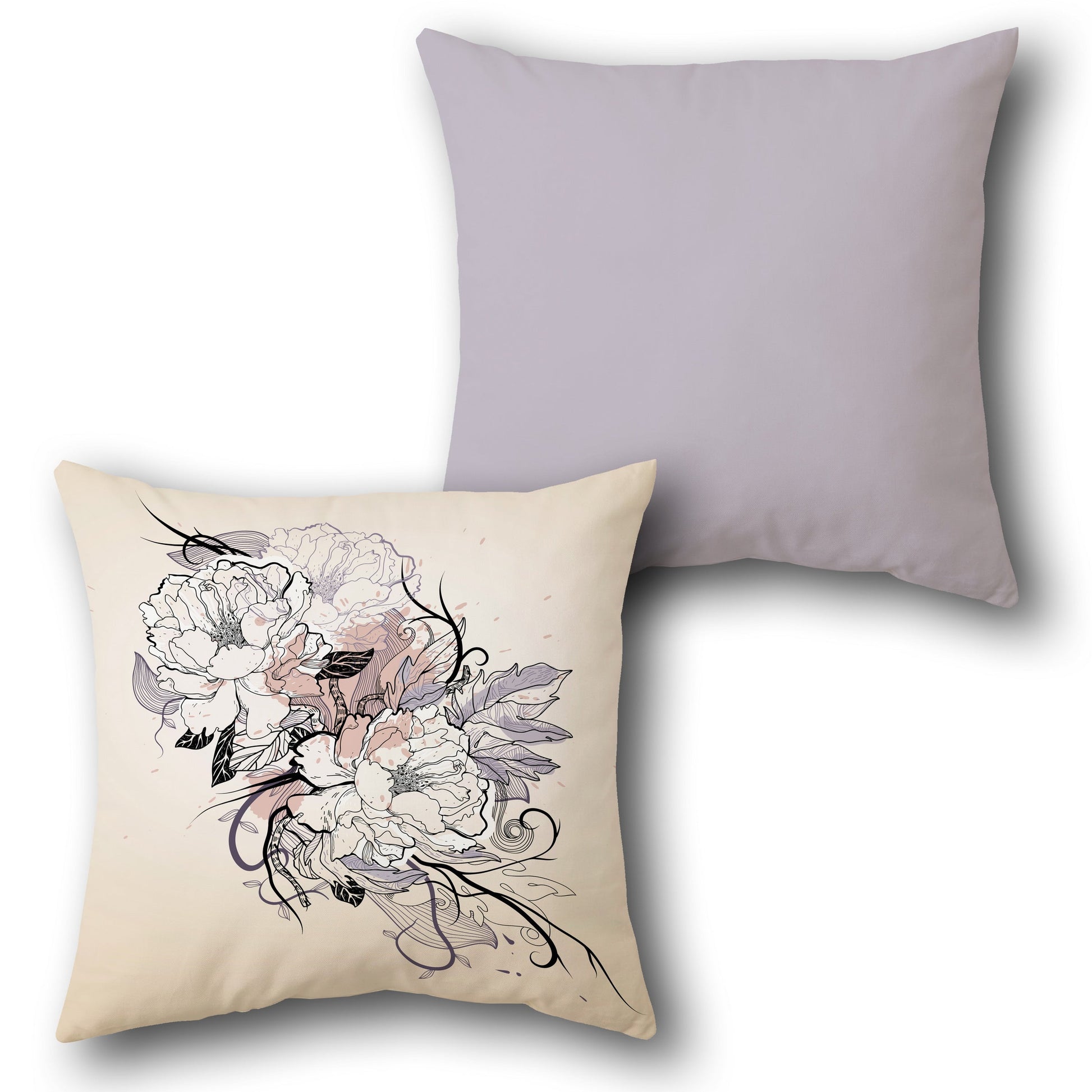 A square throw Cushion with a cream background, featuring a detailed illustration of large peony flowers in shades of white, soft pink, and muted purple, accented with delicate leaves and vines on one side. The design has a gentle, artistic feel with a focus on soft, flowing lines. The reverse side is a solid light lavender, complementing the floral tones for a cohesive look.