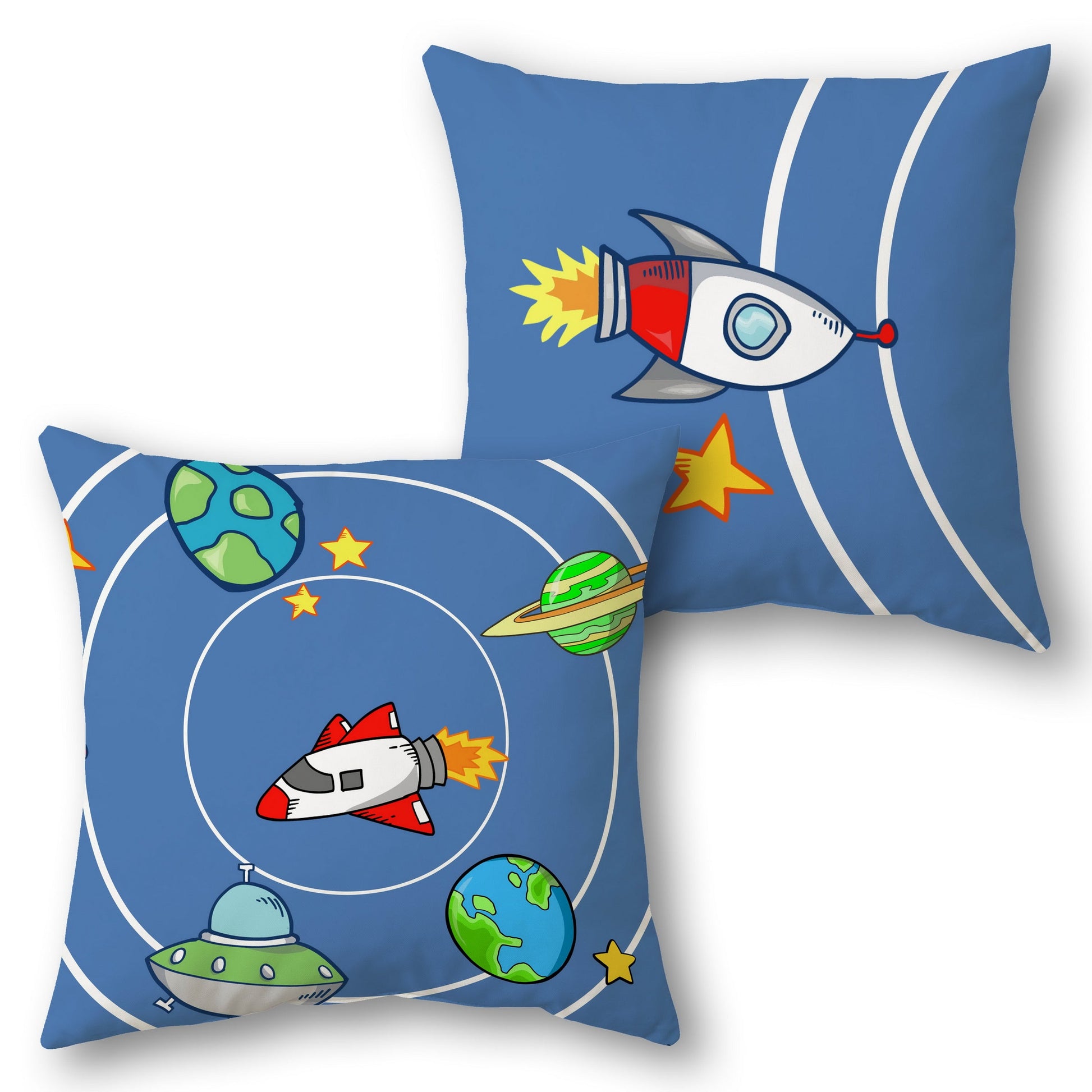 This adventurous Cushion includes cushions with a space-themed design. The first Cushion features a red and white rocket zooming through space, surrounded by planets, a UFO, and stars, all against a blue backdrop with orbital paths. The second Cushion has a simpler design with the same rocket and a few stars on a matching blue background. Cushions have a deep blue base color with white and colorful accents, perfect for aspiring astronauts and space enthusiasts.