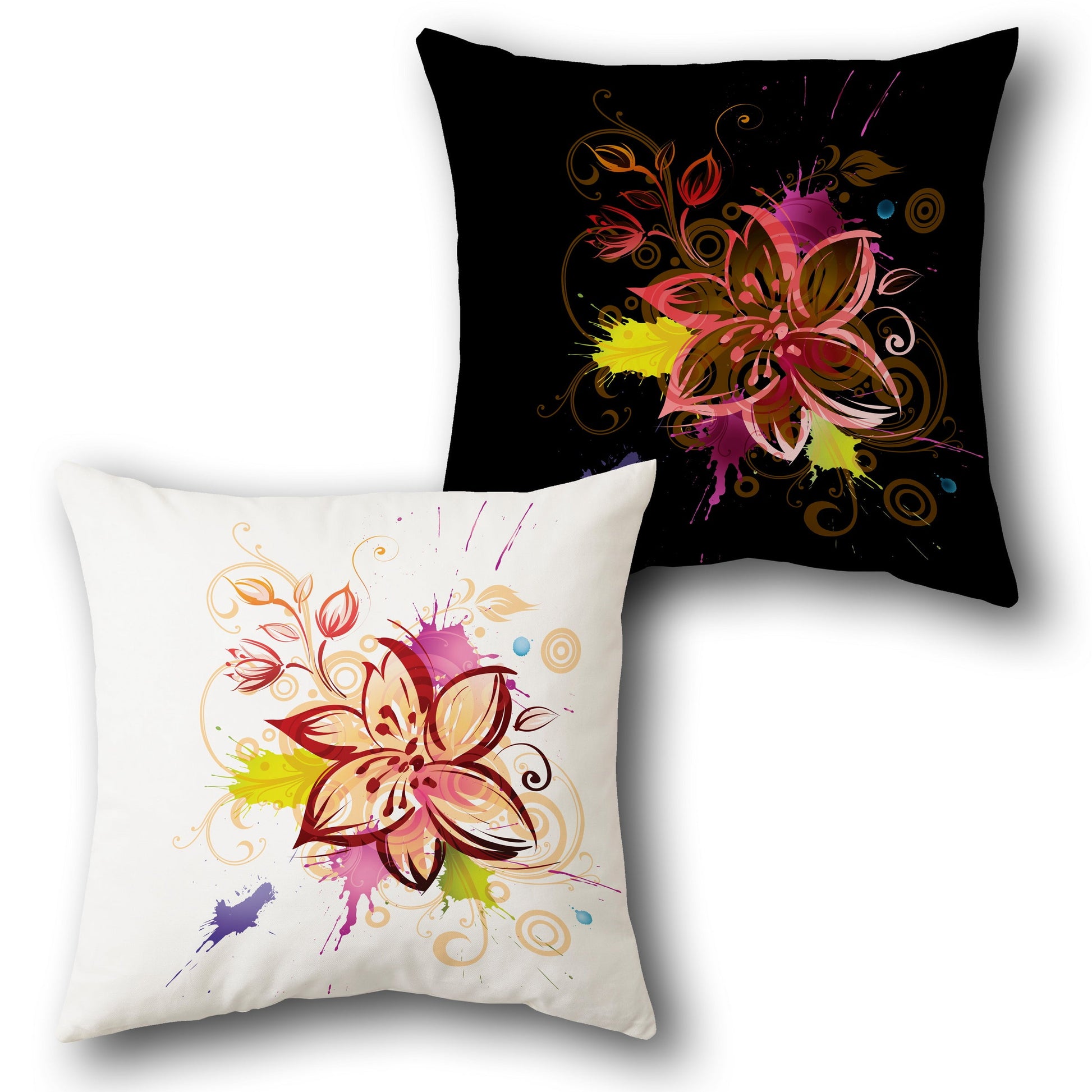 This single cushion features a front with a vibrant floral design, showcasing a large flower in shades of pink, orange, and purple with splashes of yellow, blue, and red, set against a white base, accented with swirling patterns. The back mirrors the same floral design but on a black base, creating a bold contrast.