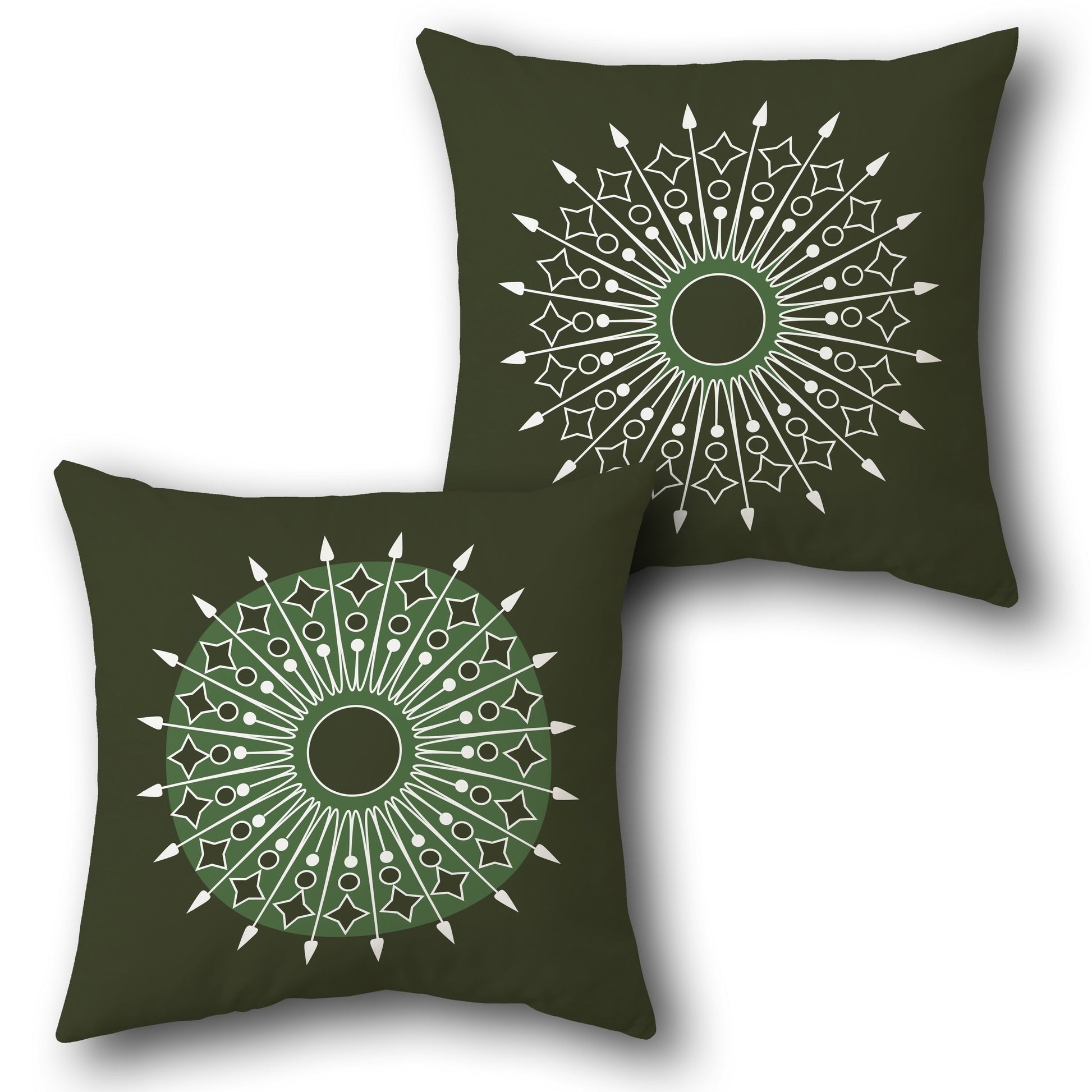 This cushion features a dual-sided design with an identical starburst mandala pattern on both sides. The design showcases a symmetrical, radiating pattern with white arrow-like shapes, stars, and dots, all set against a deep green base, creating a minimalist yet intricate look.