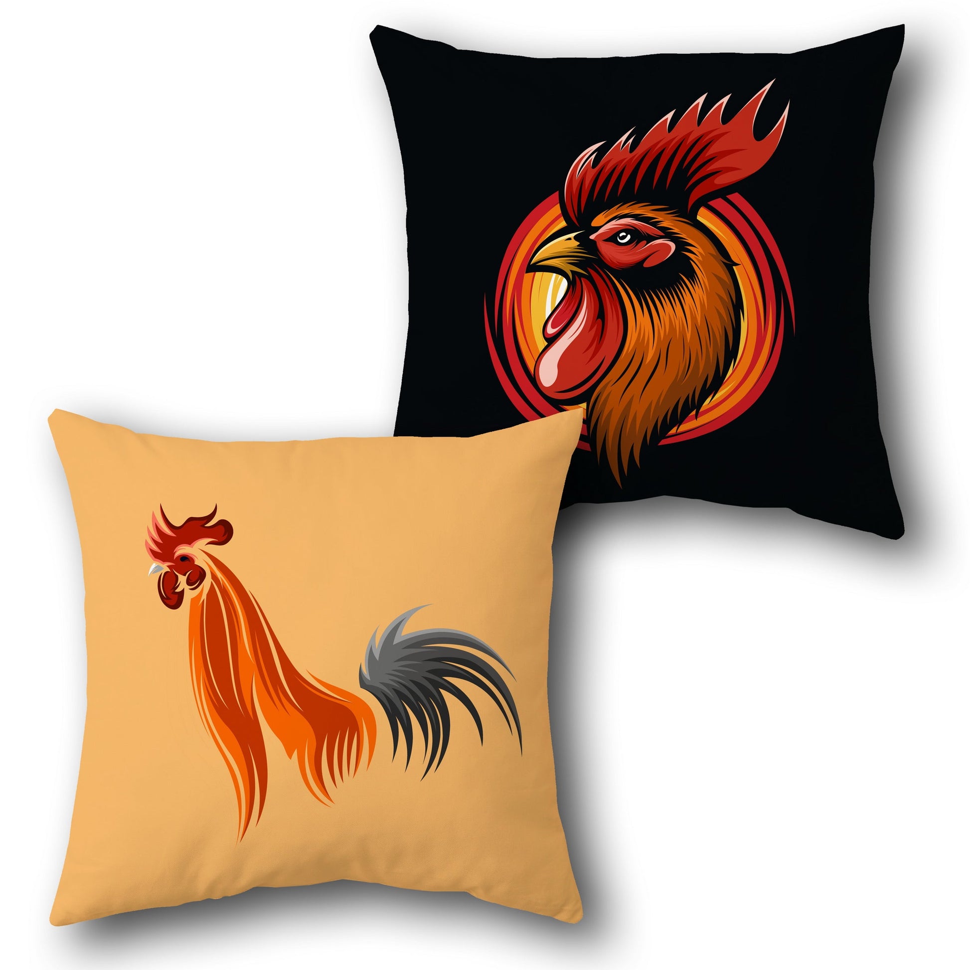 Add a bold artistic flair to your décor with this dynamic rooster Cushion . Featuring sleek, stylized illustrations of roosters in motion, these Cushions highlight fiery red, orange, and black tones for a dramatic visual impact. One Cushion presents a fierce rooster head in a circular flame-like frame on a black background, while the other showcases a full-body abstract rooster on a warm tan backdrop.
