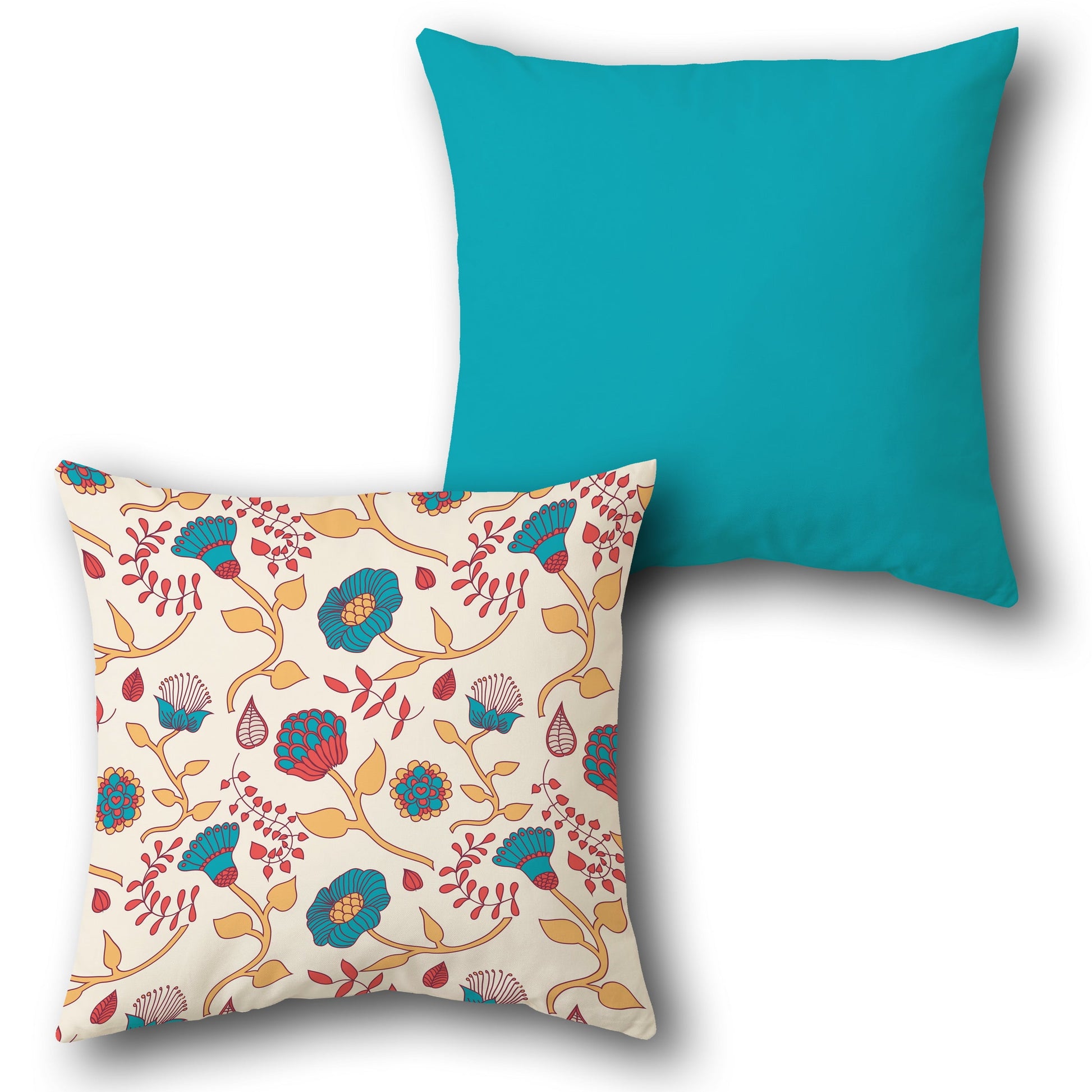This cushion features a front design with a cream base color, showcasing an intricate pattern of teal, red, and mustard yellow floral paisley motifs, creating a rich and traditional aesthetic. The back of the cushion is a solid teal, offering a striking contrast to the detailed front design.
