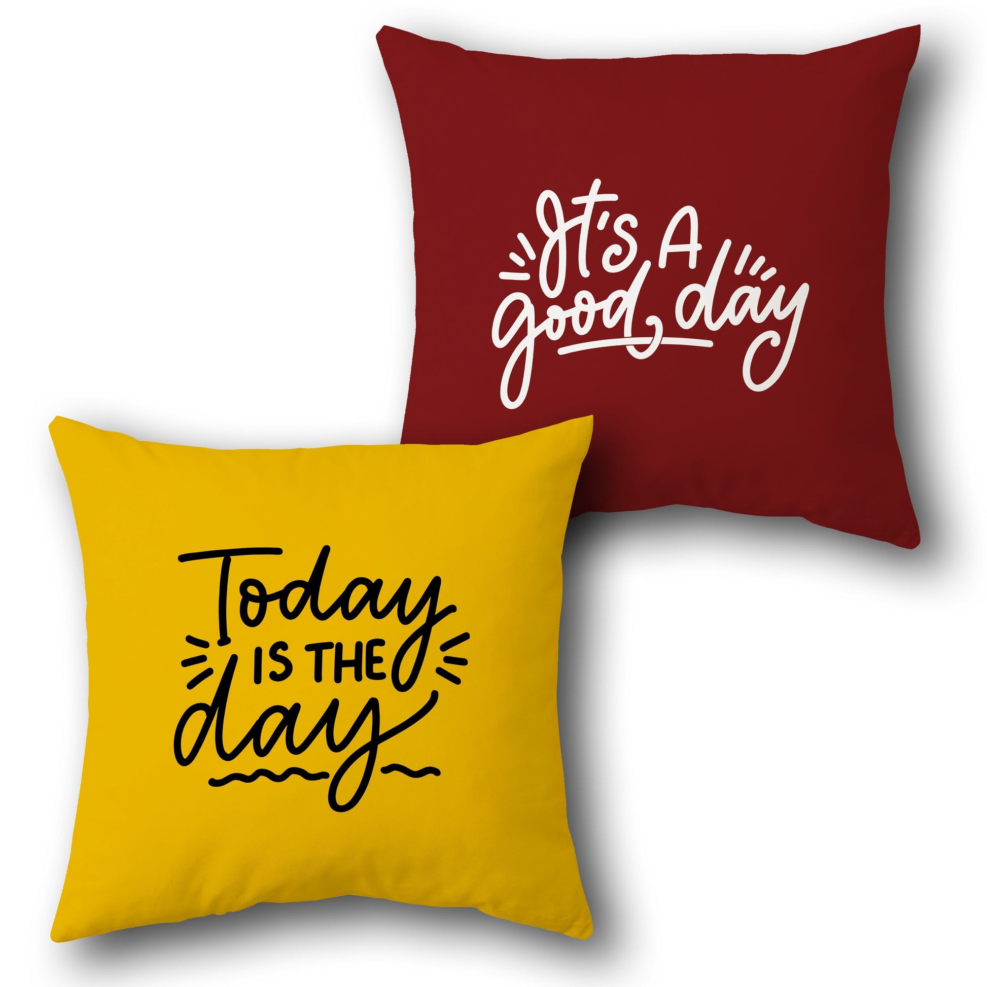 This single cushion spreads positivity with front and back designs. The front design features a mustard yellow base color (similar to peela rang) with the text "TODAY IS THE DAY" in black cursive font, accented by small star bursts. The back design has a deep red base color (akin to laal rang) with the text "IT'S A GOOD DAY" in white cursive font, also with star burst accents.