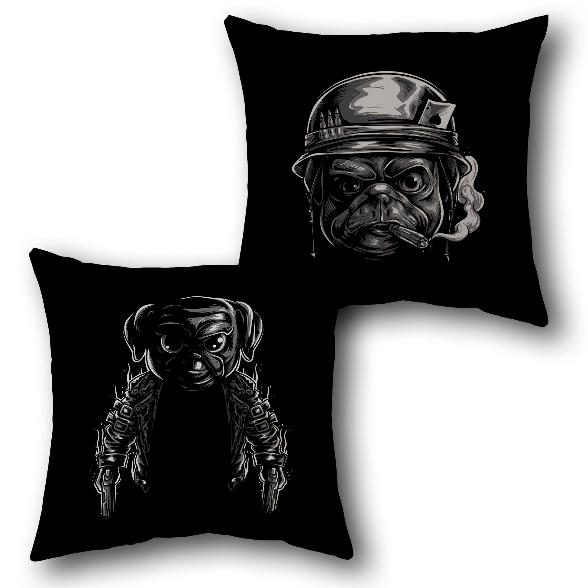 Unleash hardcore vibes with the Tough Pug Warrior Cushion . This intense showcases a battle-hardened pug in two fierce personas—one as a cigar-smoking soldier in a helmet, and the other as a leather-jacket-wearing, dual-wielding gunman. against a bold black background, the detailed monochrome illustrations deliver maximum attitude and edge, making this Cushion a perfect fit for man caves, urban lofts, or anyone with a love for gritty dog-themed art.