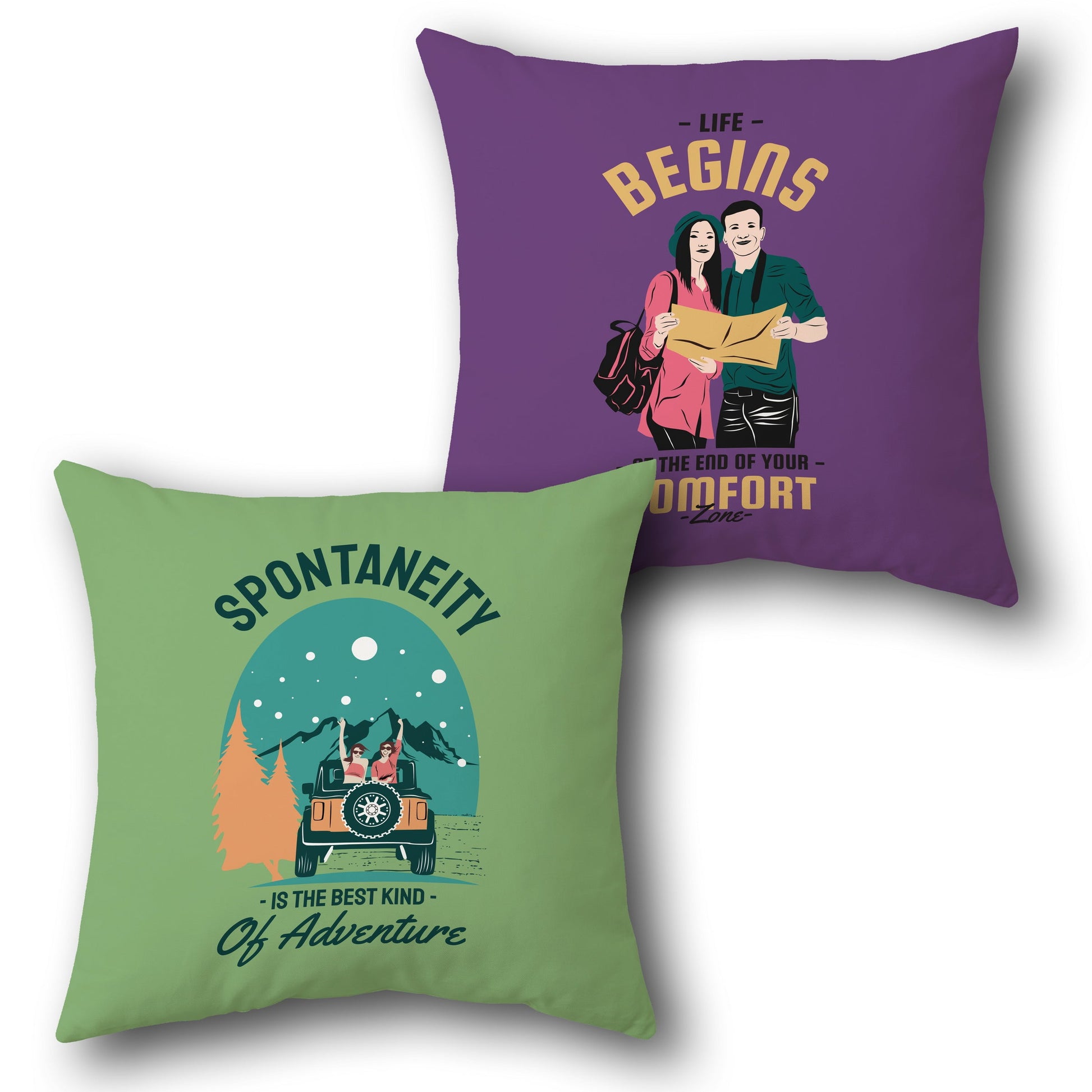 This single cushion features a dual-sided design for travel enthusiasts. The front side is a mustard yellow (similar to the desi color "peela") with the text "TRAVEL THE WORLD" in black, featuring a vintage suitcase and a world map outline. The back side is a teal blue (akin to the desi color "teal neela") with the text "MAKE TODAY AN ADVENTURE" in black, showing a compass and a mountain range. The base colors are mustard yellow and teal blue, creating a vibrant and exploratory contrast.