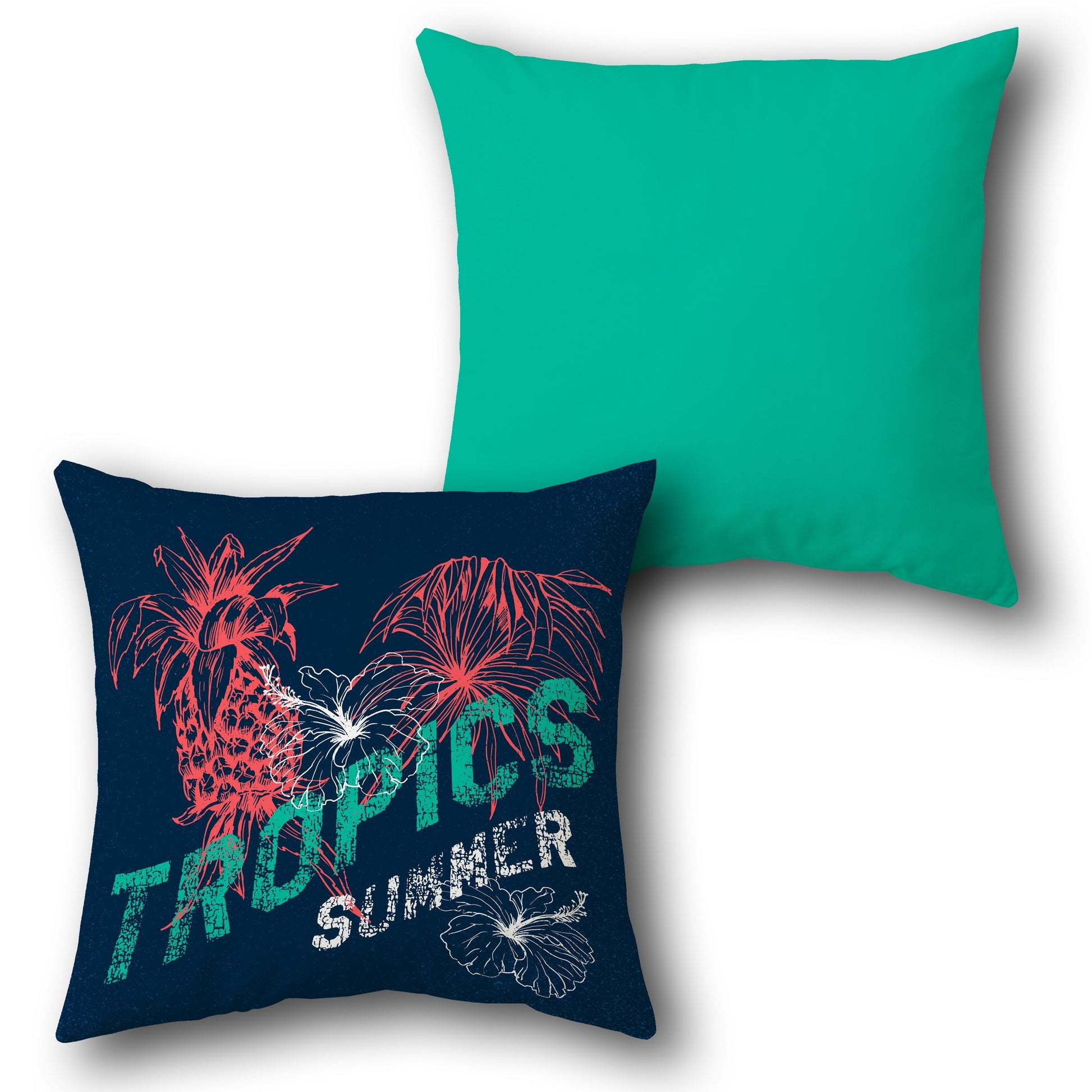 This single cushion features a tropical summer theme with a front and back design. The front showcases a vibrant design with a pink pineapple, palm leaves, and hibiscus flowers, paired with the text "TROPICS SUMMER" in green and white. The back is a solid turquoise color. The design uses pink, green, and white accents against a navy blue base color, with a turquoise back, creating a fresh and summery vibe.