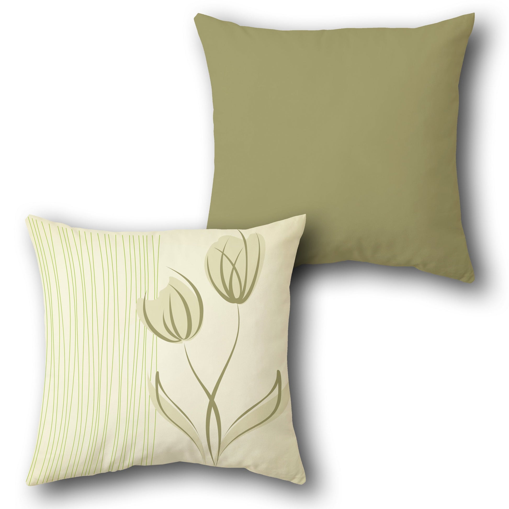 his includes square throw Cushions. One Cushion features a minimalist design with three tulip silhouettes in soft green on a cream base, accented by vertical green stripes on the left side, creating a calm and modern look. The other Cushion is a solid olive green, offering a subtle contrast. Ideal for adding a touch of understated elegance to a contemporary living room or bedroom.