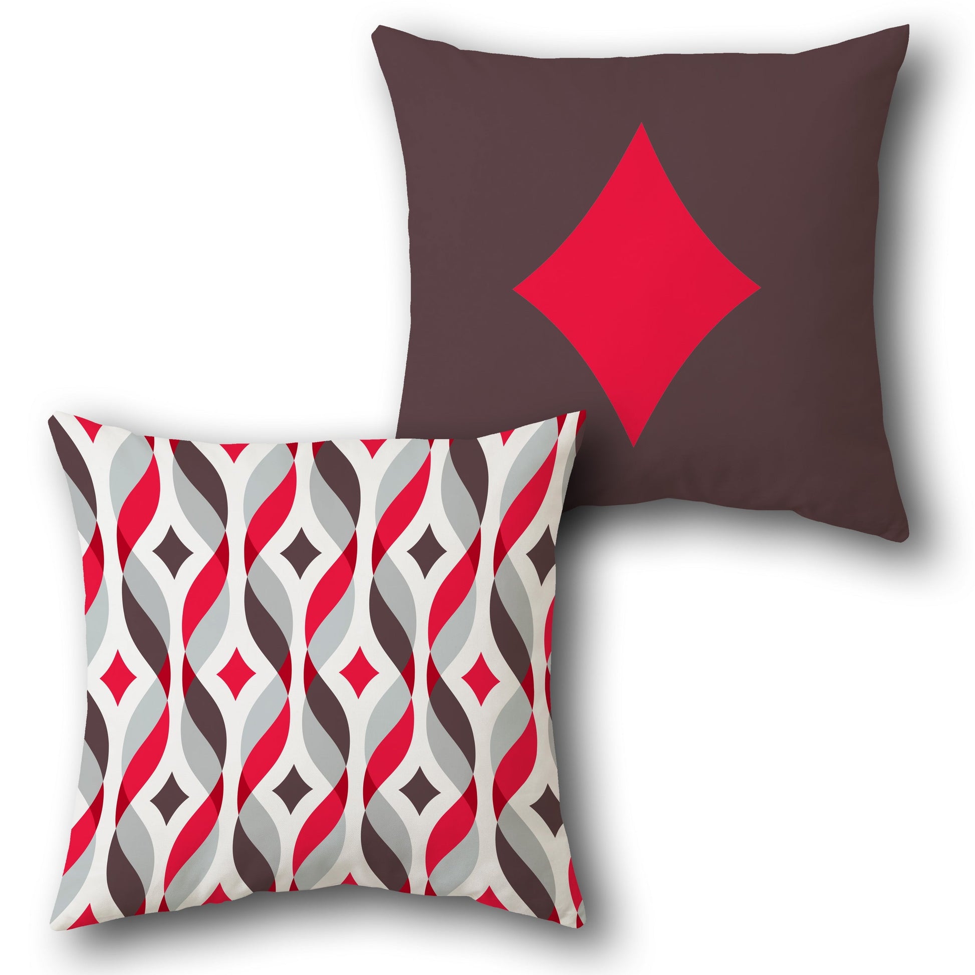 This cushion features a bold twisted diamond pattern on the front, with interlocking shapes in red, maroon, gray, and white, creating a modern geometric design. The back has a single large red diamond centered on a solid maroon background, offering a minimalist contrast. The base color of the front is white, while the back's base color is maroon.