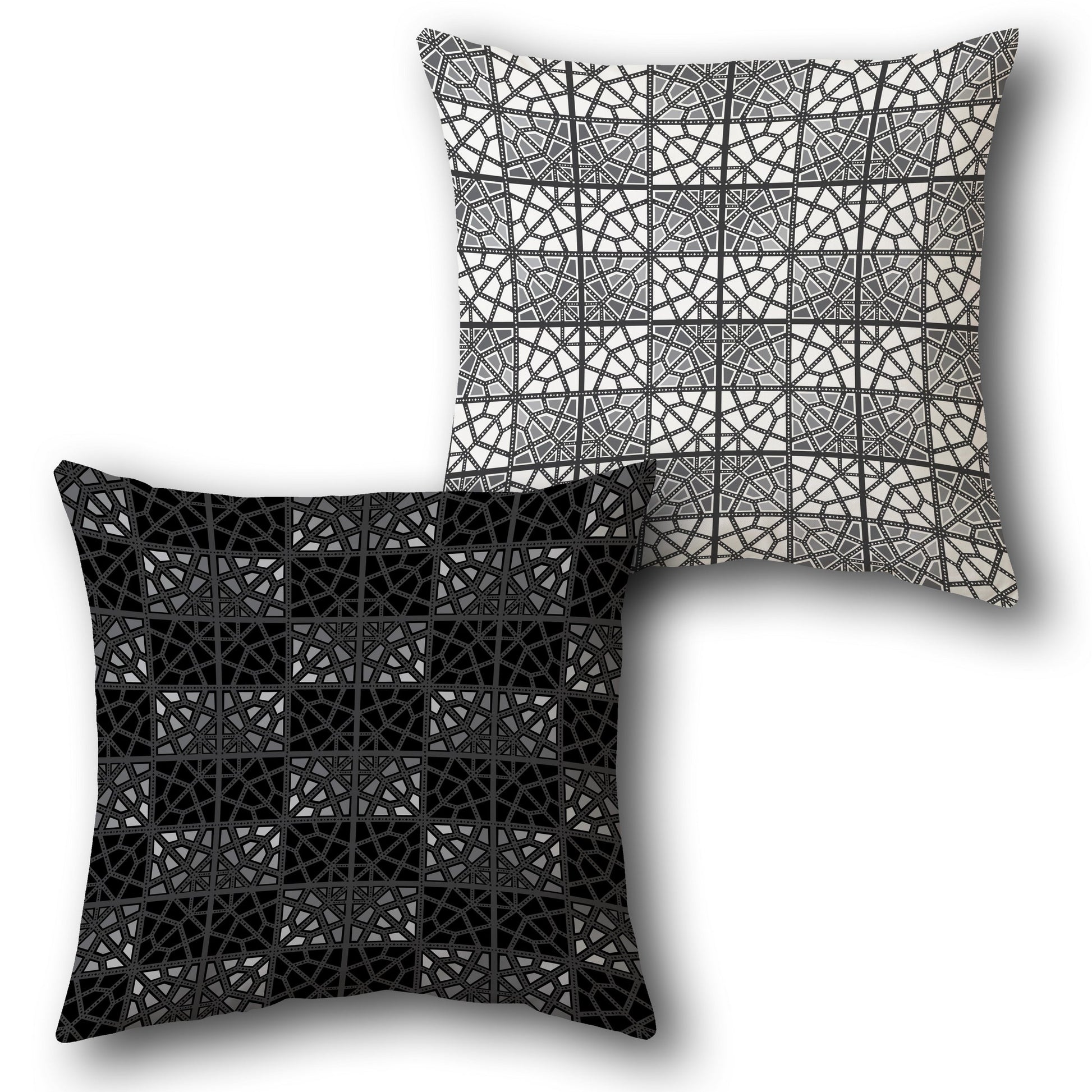 The Urban Grid Cushion brings a sophisticated and structured look to any living space. Featuring an intricate geometric lattice pattern inspired by city maps and architectural lines, this includes contrasting color schemes—one with a white base and one with a black base. Shades of grey and black interlace across the design, creating a striking visual rhythm that complements modern, minimalist, and industrial interiors.