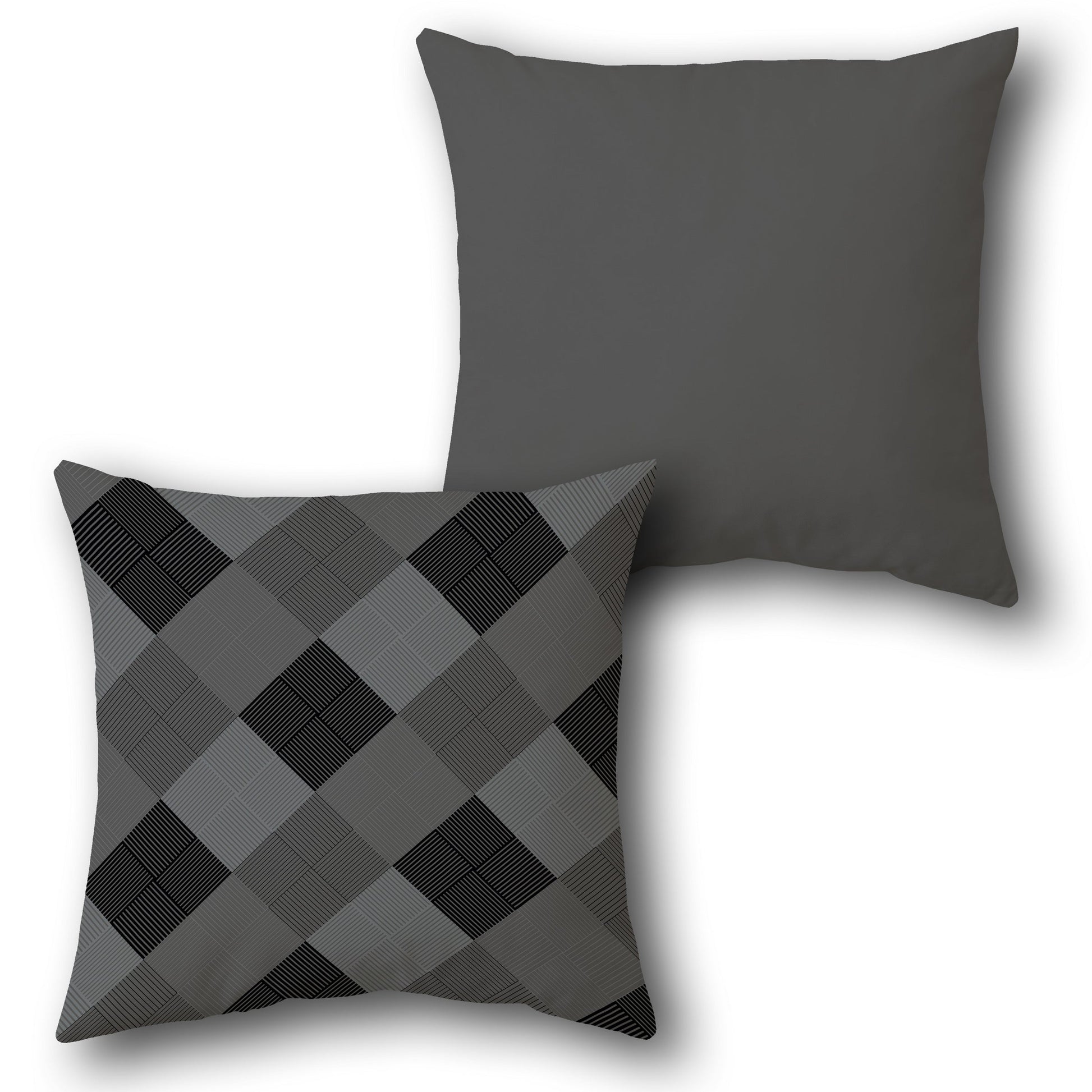 This modern Cushion features complementary designs: one with a stylish gray and black plaid pattern, and the other in a solid charcoal gray. The plaid design uses varying shades of gray intersected by bold black diagonal lines to create a contemporary, textured look, while the solid Cushion offers a sleek, minimalist aesthetic. Both Cushions have a base color of deep gray, making them versatile for modern and industrial-themed interiors.