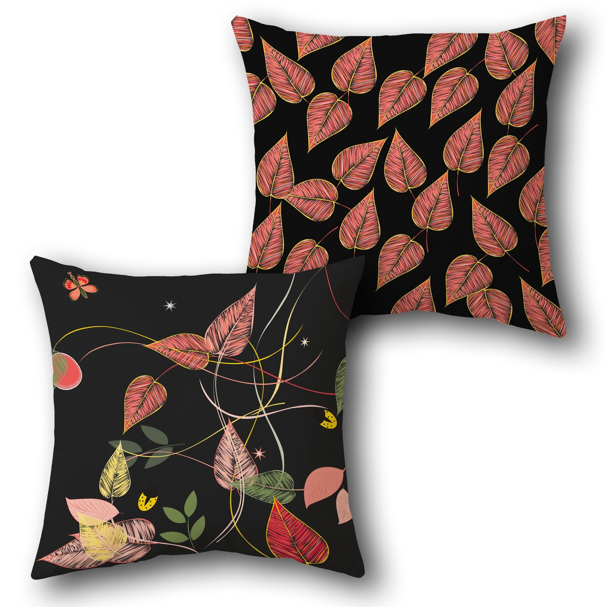 A of square decorative Cushions with a bold botanical theme. One Cushion features a scattered pattern of pink and orange leaves on a black background, while the other showcases a whimsical design with interconnected leaves, small insects, and floral accents in shades of pink, orange, green, and yellow, also on a black base. Perfect for adding a lively, nature-inspired pop to your space.