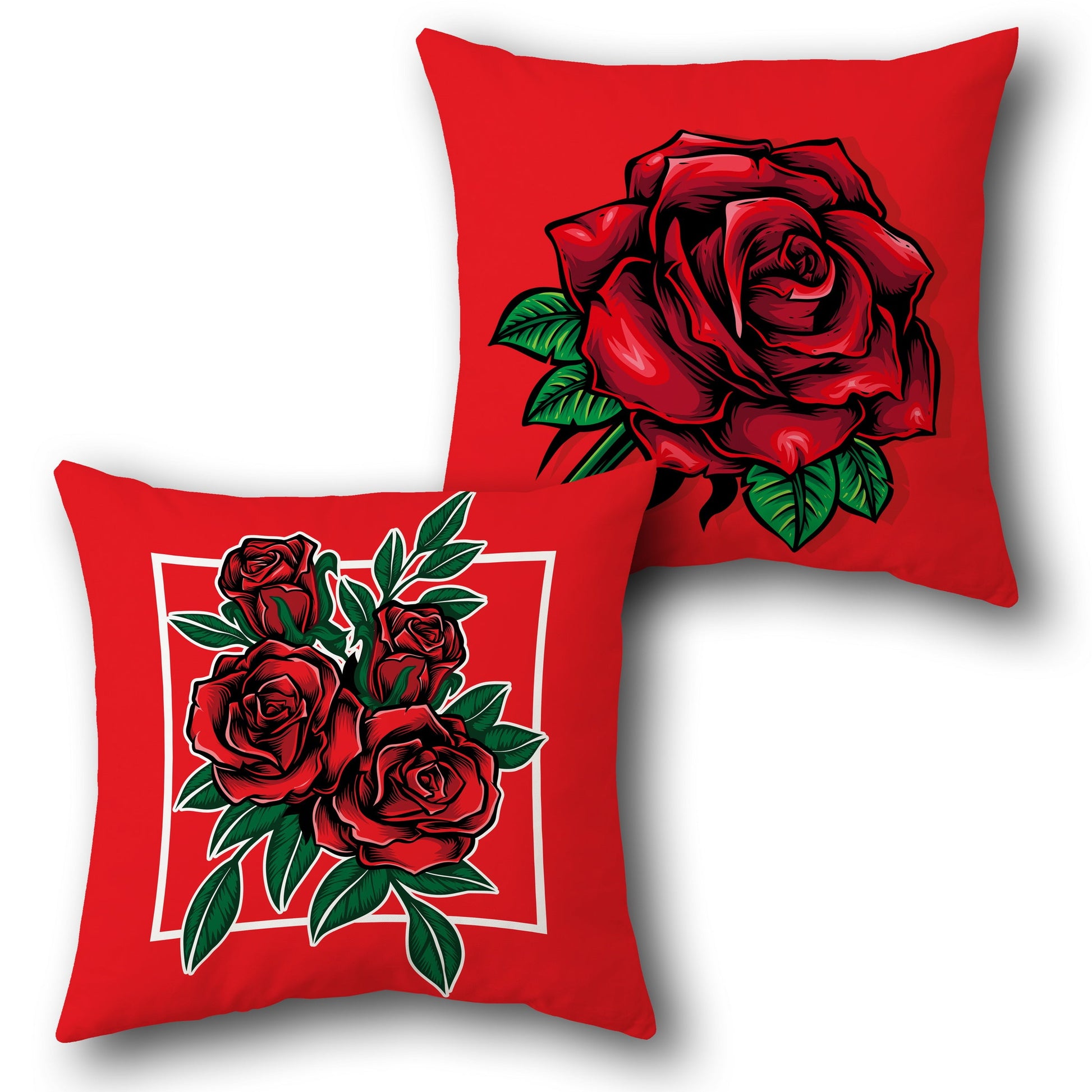 A of square throw Cushions featuring bold red rose illustrations on a vivid red background. One Cushion displays a cluster of three roses with green leaves in a white-framed design, while the other showcases a single large rose with detailed green foliage. Perfect for adding a passionate and striking accent to your home decor.