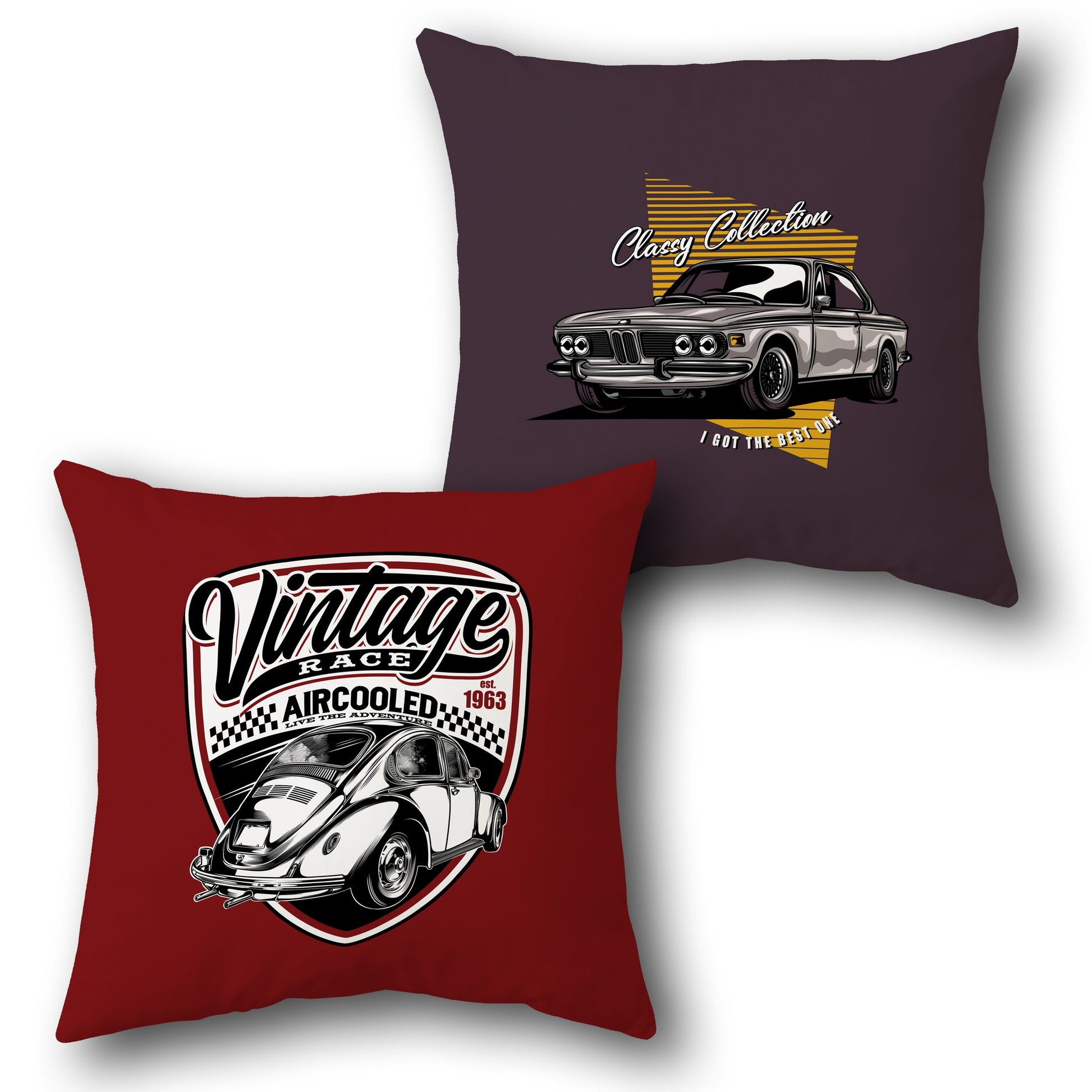 This cushion features a car-themed design with a maroon base color on the front and a dark purple base color on the back. The front displays a "Vintage Race" theme with a white vintage car, a checkered pattern, and the text "VINTAGE RACE AIRCOOLED 1963 LIVE THE ADVENTURE" in black and white. The back showcases a "Classy Collection" theme with a silver classic car, the text "Classy Collection I GOT THE BEST ONE" in white, and orange geometric accents.