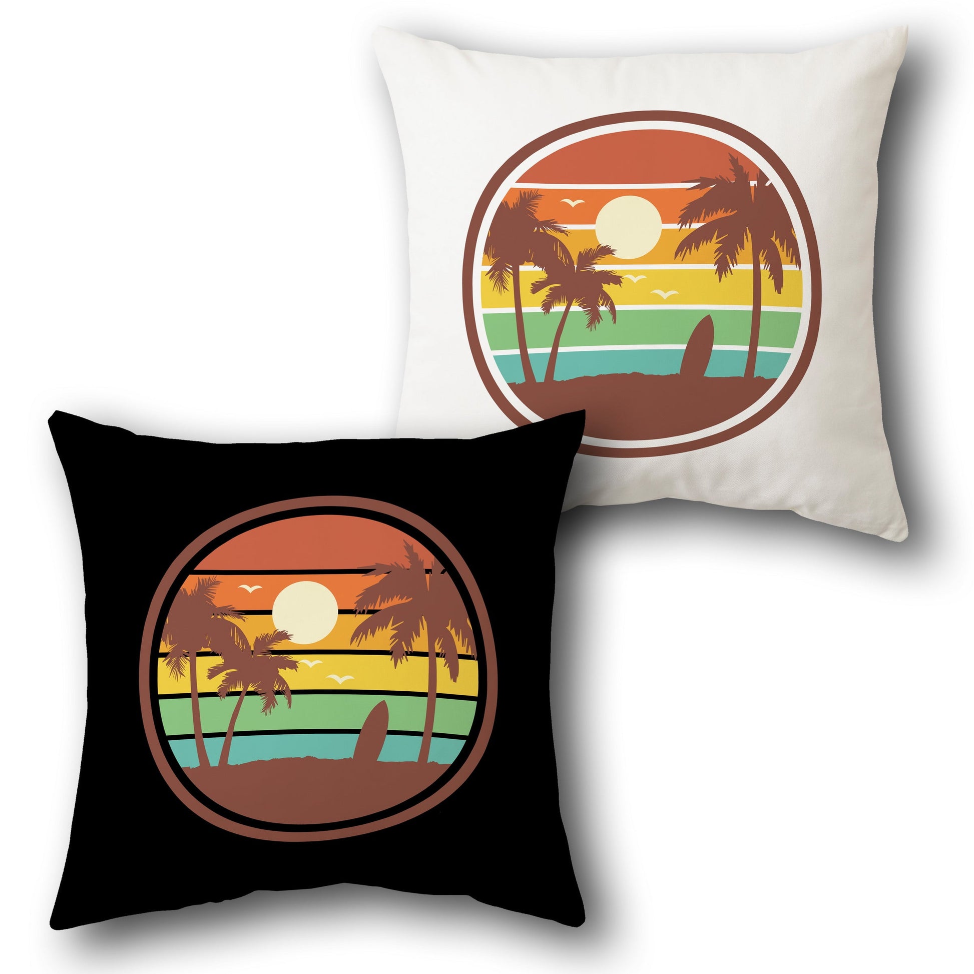 Capture the laid-back vibes of a beach sun with this tropical-themed Cushion design . Featuring a circular scene with palm trees, a ting sun, birds, and a surfboard silhouette, this design comes in two versions: one with a clean white base and the other with a bold black base. The background is composed of vibrant horizontal stripes in burnt orange, sun red, golden yellow, lime green, and ocean teal, giving the a warm, retro aesthetic.